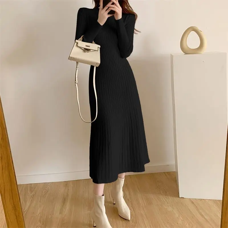 Long Mid-length Knee-length Sweater Dress with a Semi-high Neck and Knitted Fabric for Women in Autumn and Winter