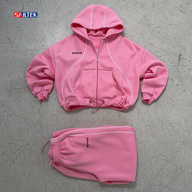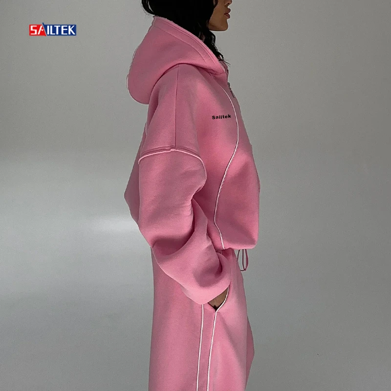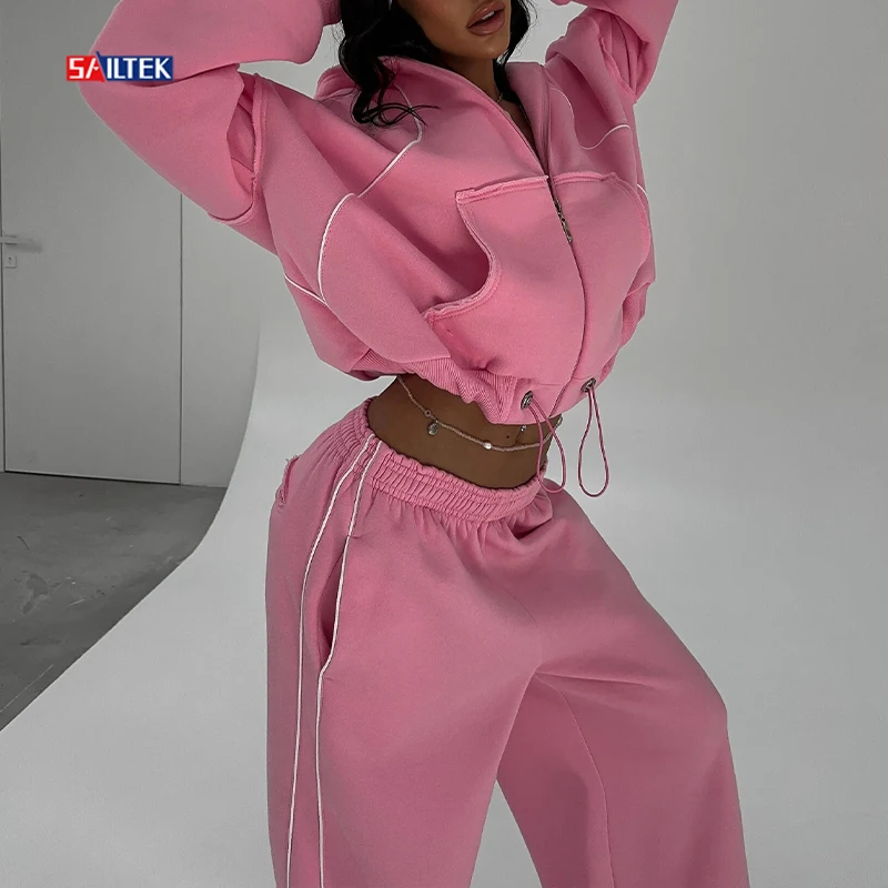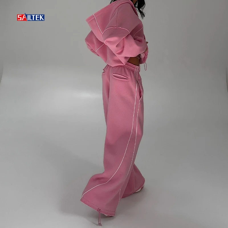 Luxury Autumn Winter Women Clothing Wholesale Pink Zip up Tracksuits High Quality Two Piece Wide Leg Pants and Zipper Hoodie Set