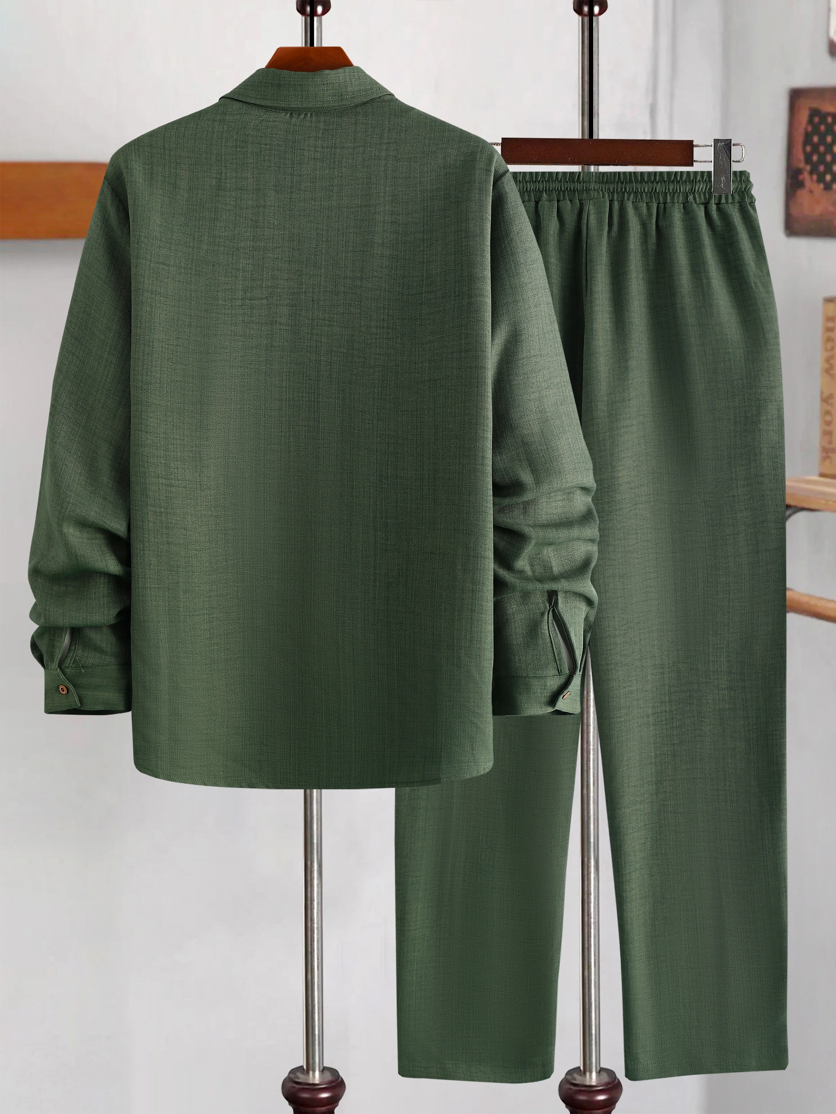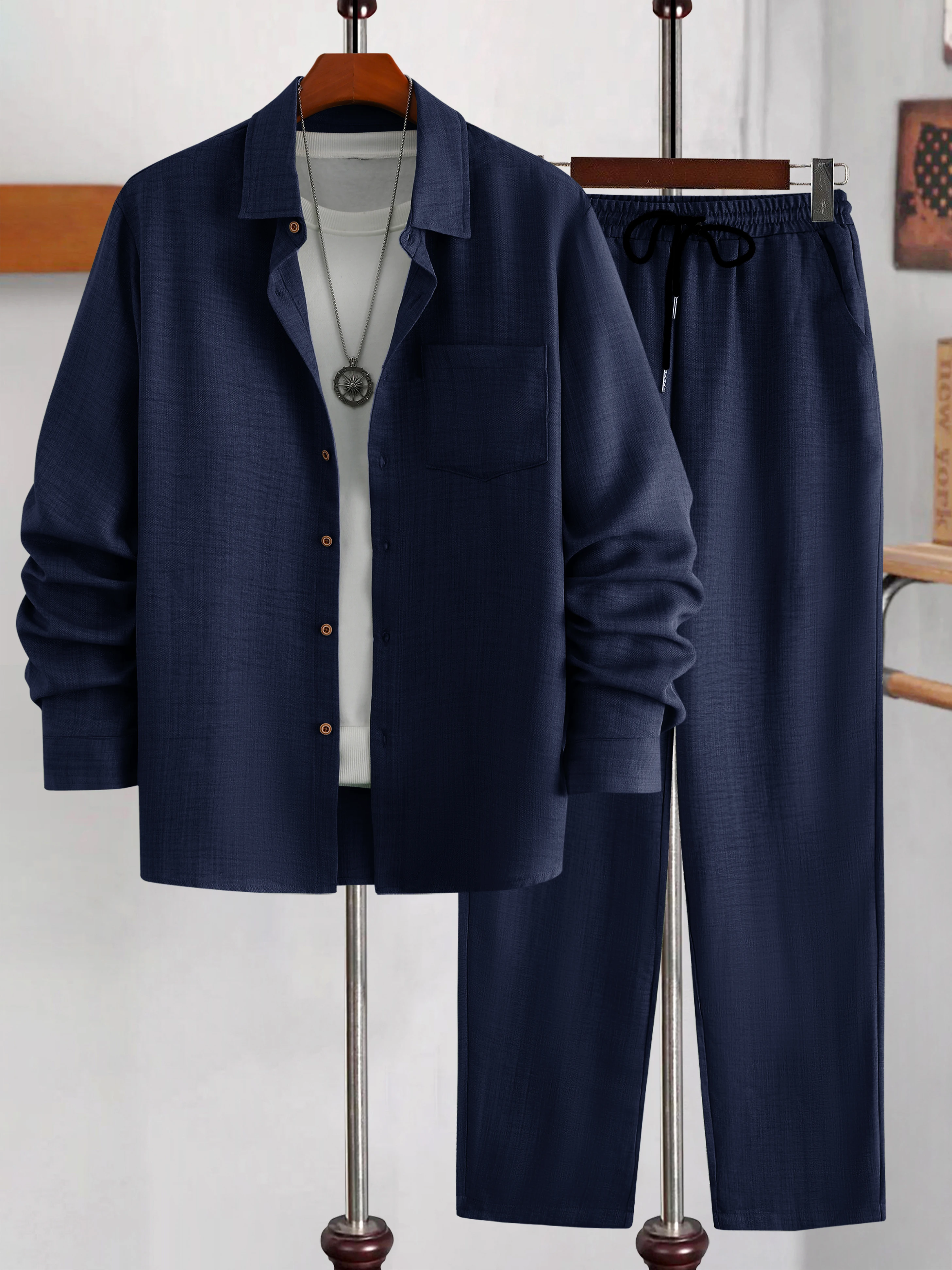 Men’s Spring Autumn Two-Piece Set Solid Color Commuter Suit Long-Sleeved Lapel Shirt Drawstring Pants Woven Fashionable Match