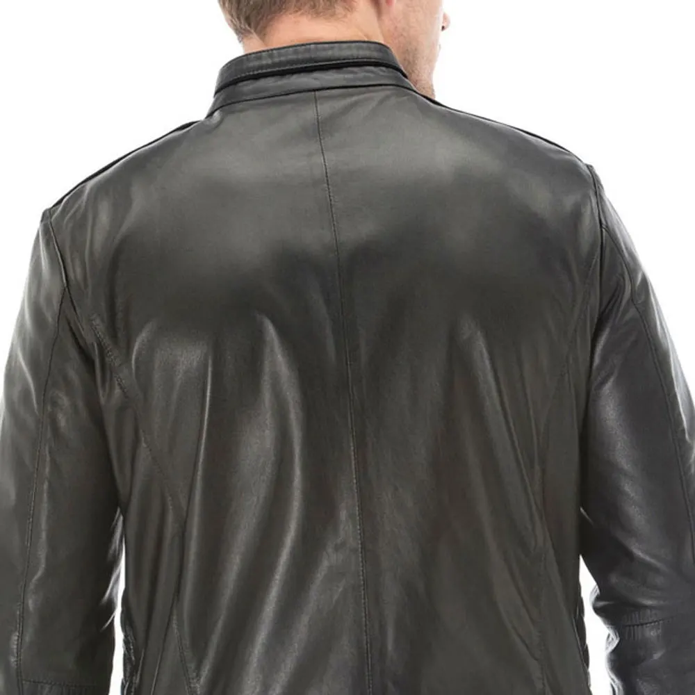 Men’s Winter High Street Fashion Genuine Leather Jacket Stand Pattern Pocket Breathable Water-Proof Warm Top Fabric Black Color