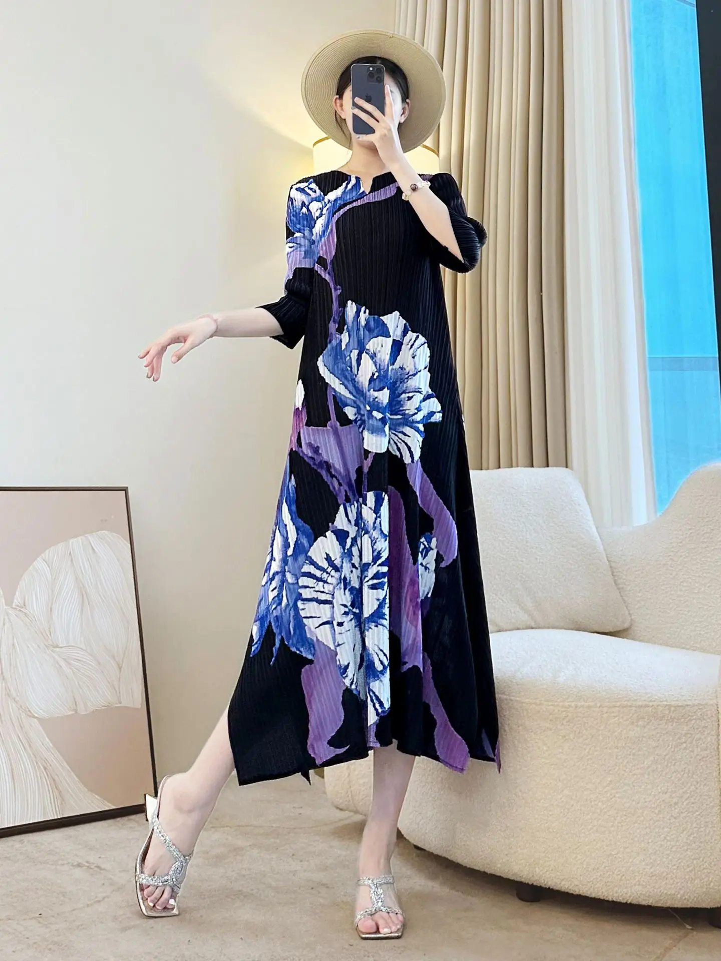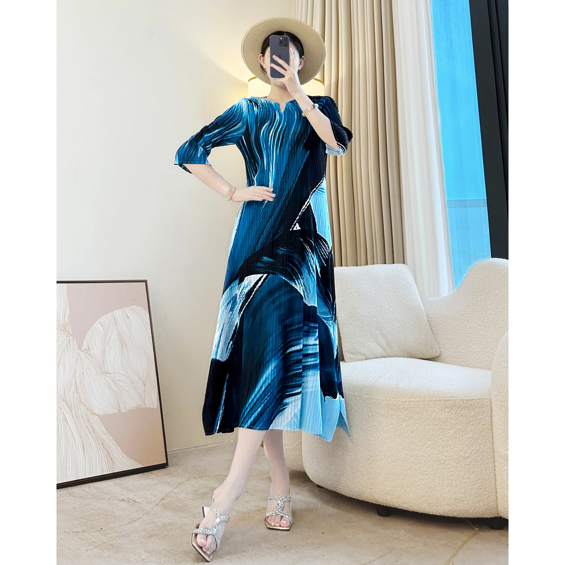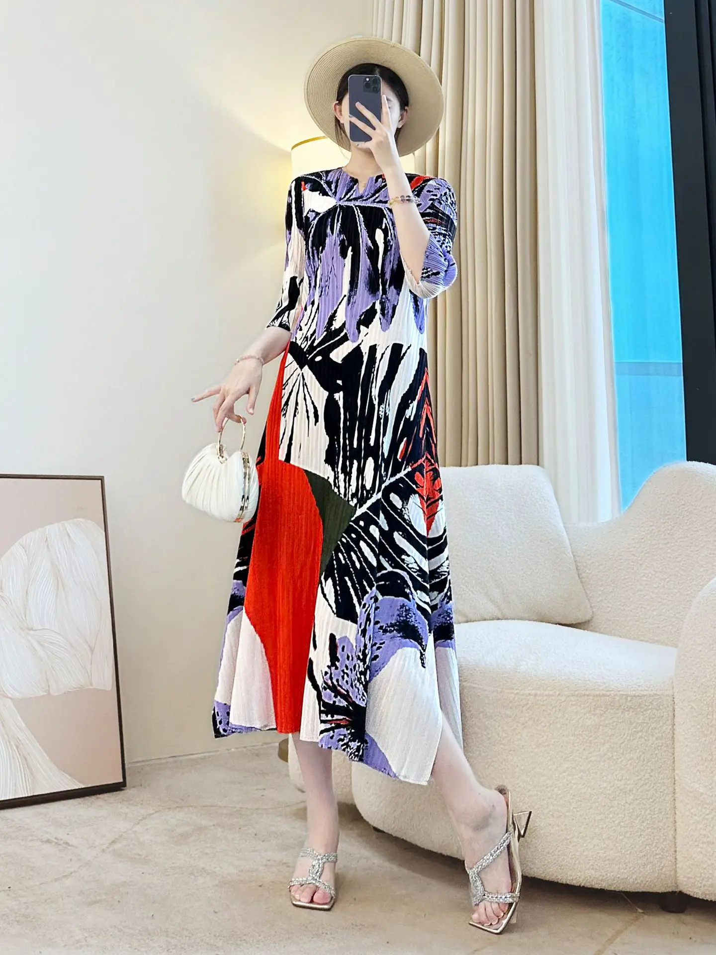Miyake 2025 Autumn Elegant Pleated Dress Niche Design Slimming Long Crewneck Dress for Fat Girls Casual Midi Length Solid