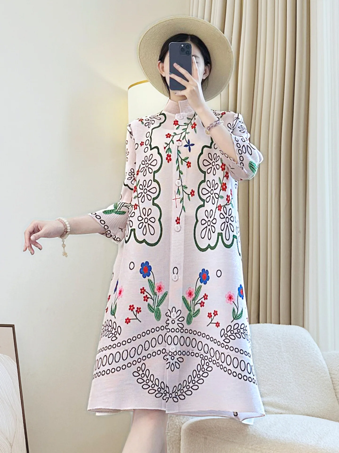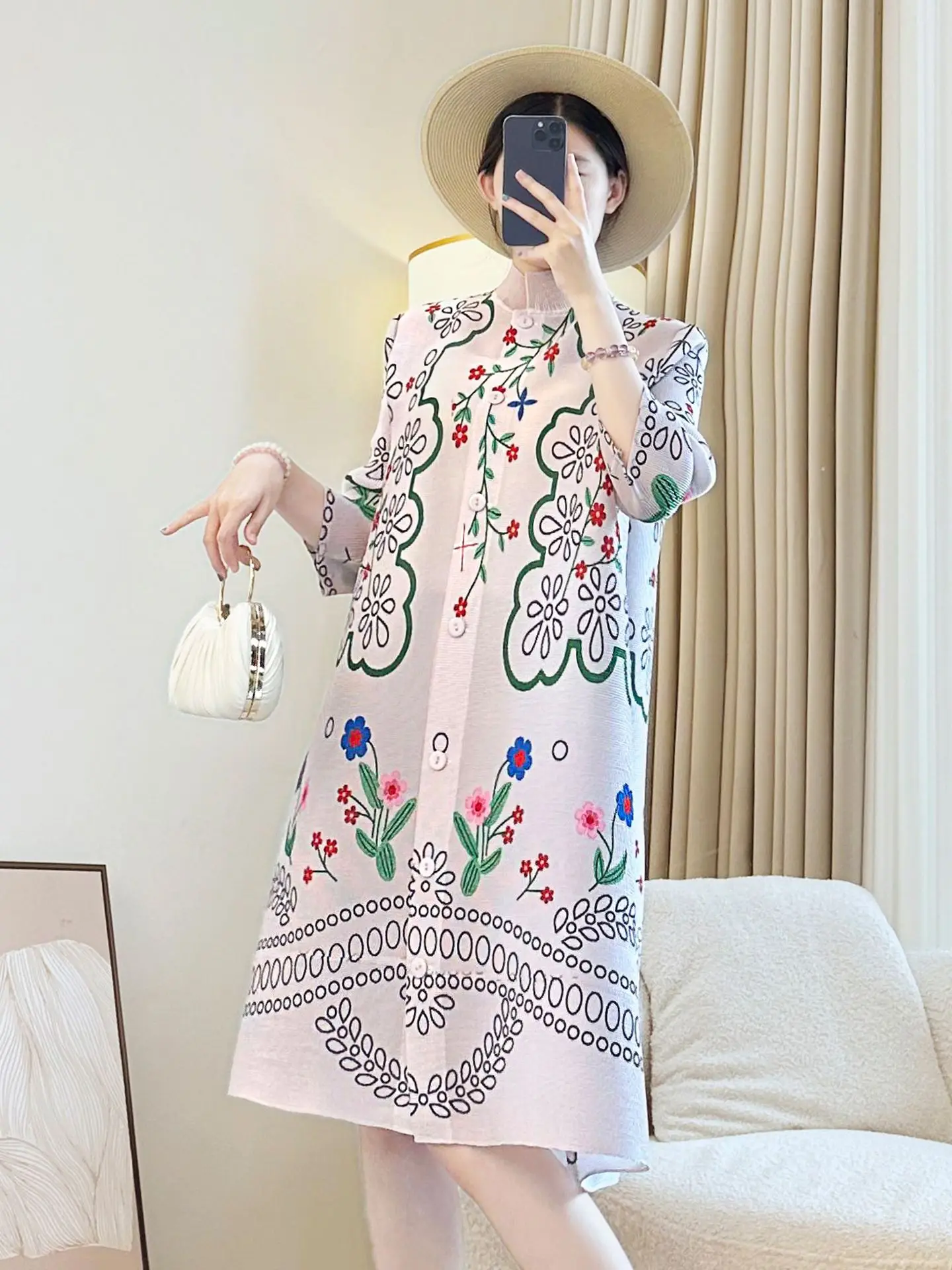 Miyake Fashion Elegant Mid-Length Dress Age-Reducing Loose Pleated Solid Large Size Mother’s Early Autumn Meat Covering New