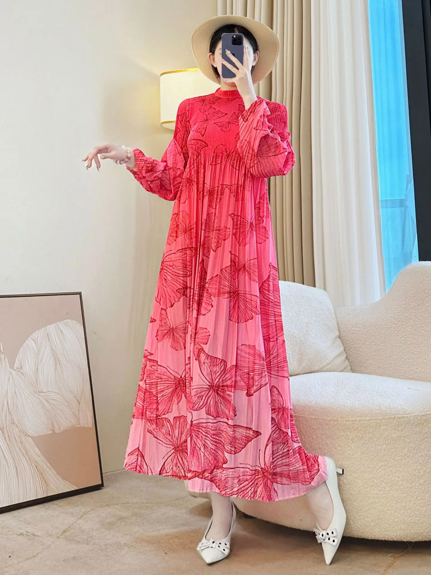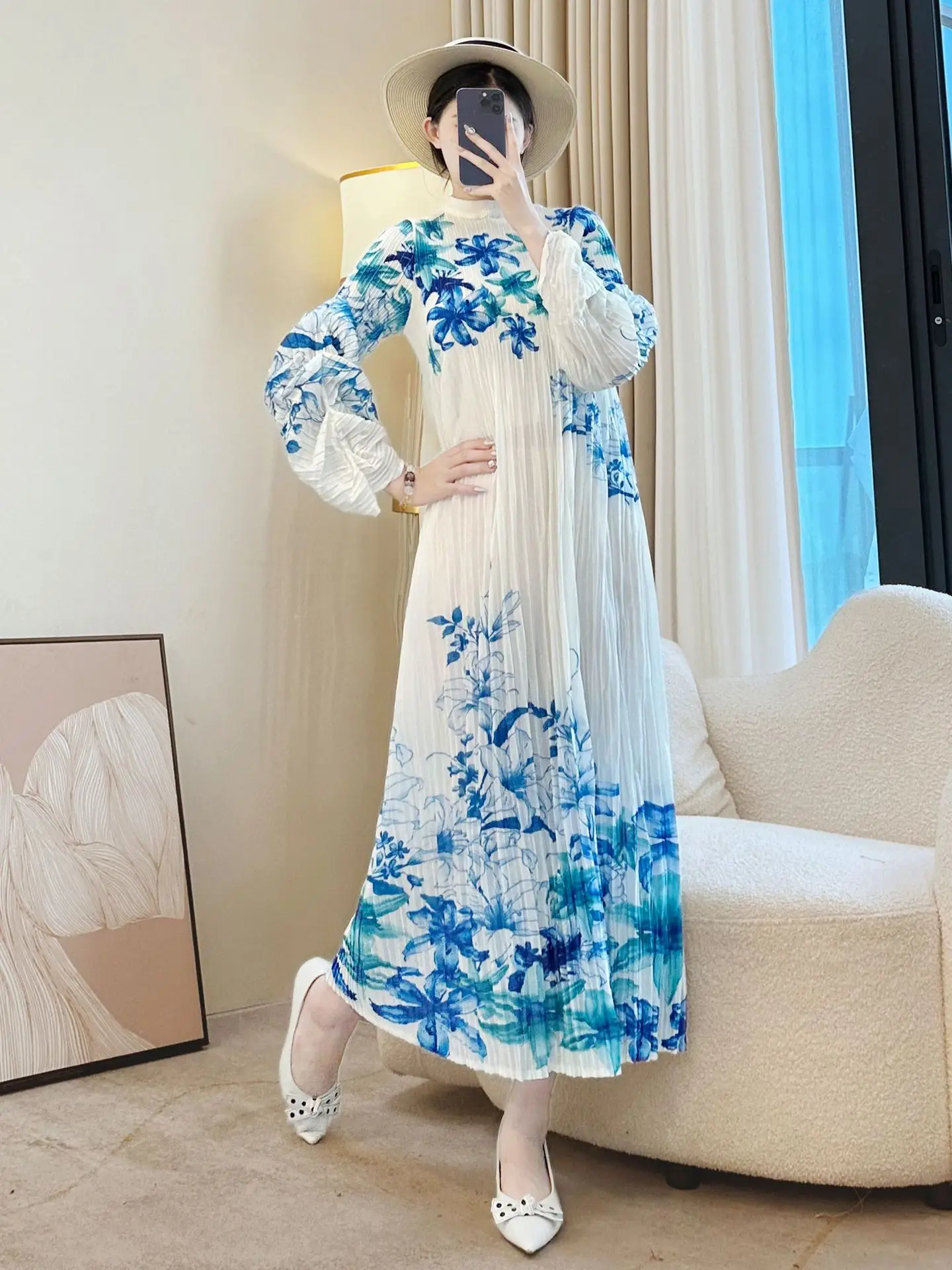 Miyake pleated printed loose temperament dress for autumn 2025 new women’s clothing, slimming mid length skirt for women