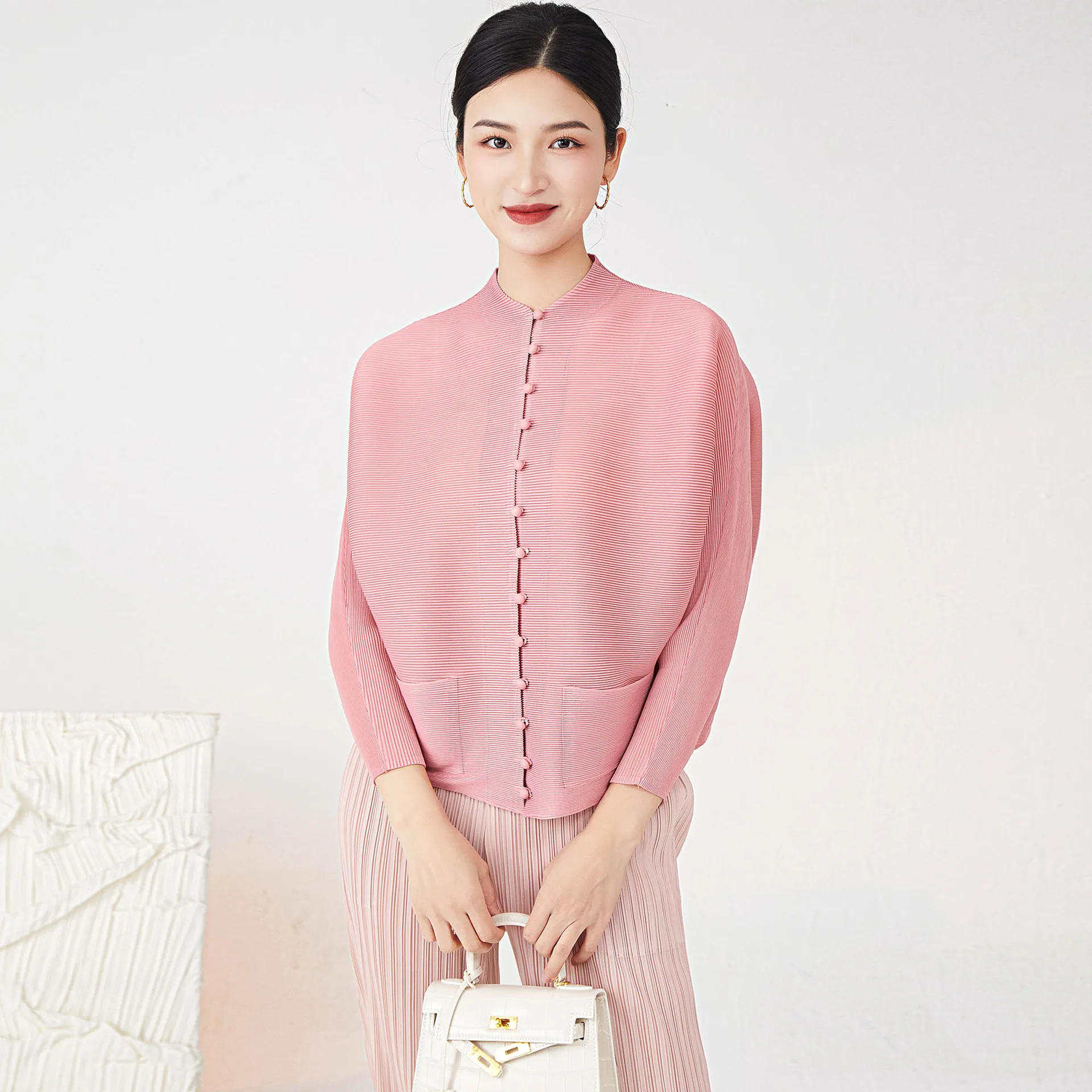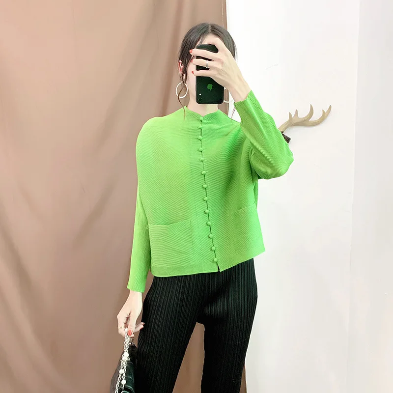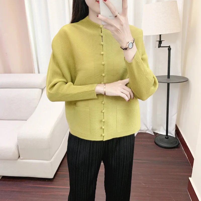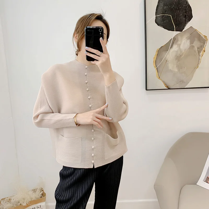 Miyake Retro Mom Cardigan Top New Solid Color Button Loose Large Size Long Sleeve Pleated Jacket Women’s Clothing Wholesale