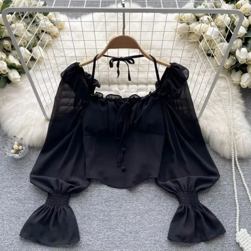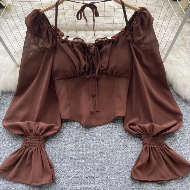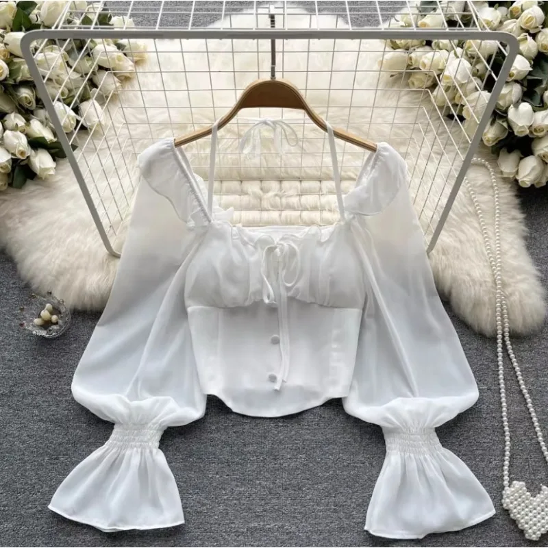 New Arrival Autumn Full Sleeve Square Collar Shirts Crop Top Solid Casual Blouse Ladies Clothing Clothes Women Wholesale