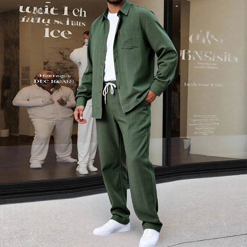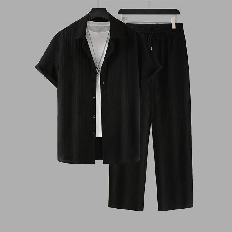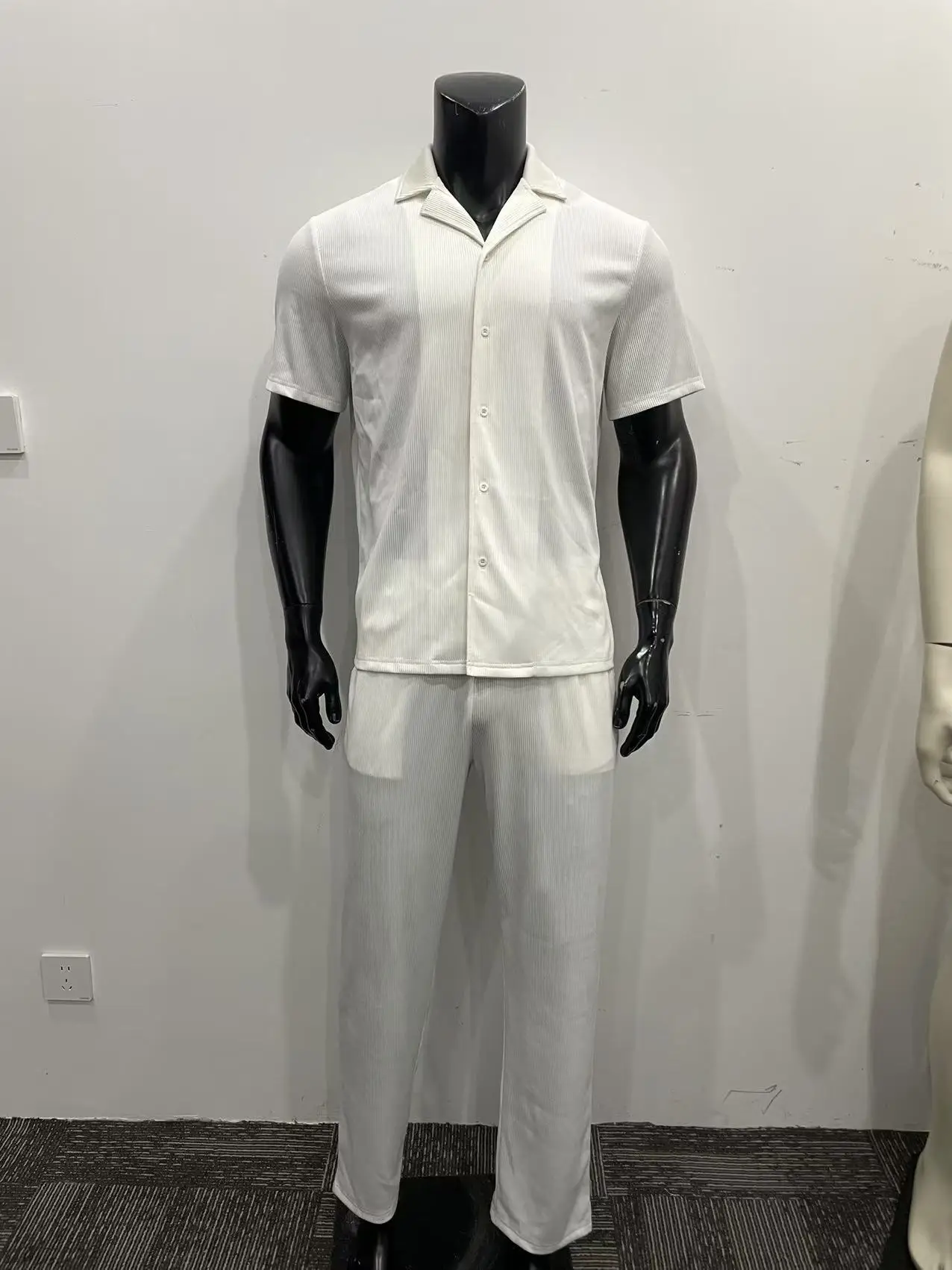 New Arrival Pleated Fabric Short Sleeve Button Down Men’s Shirt Sets Solid Color Summer Outfit Two Pieces Men Casual Set