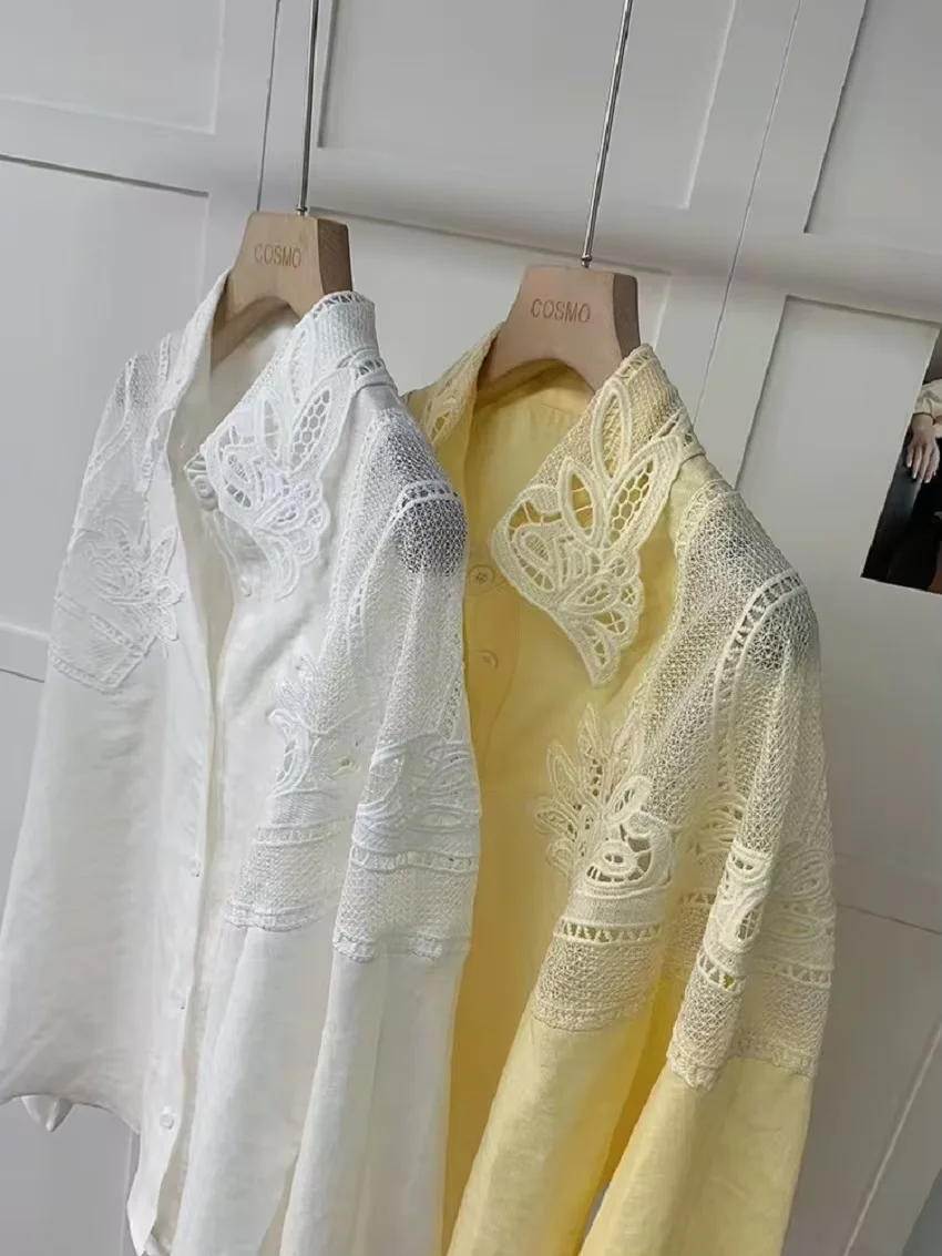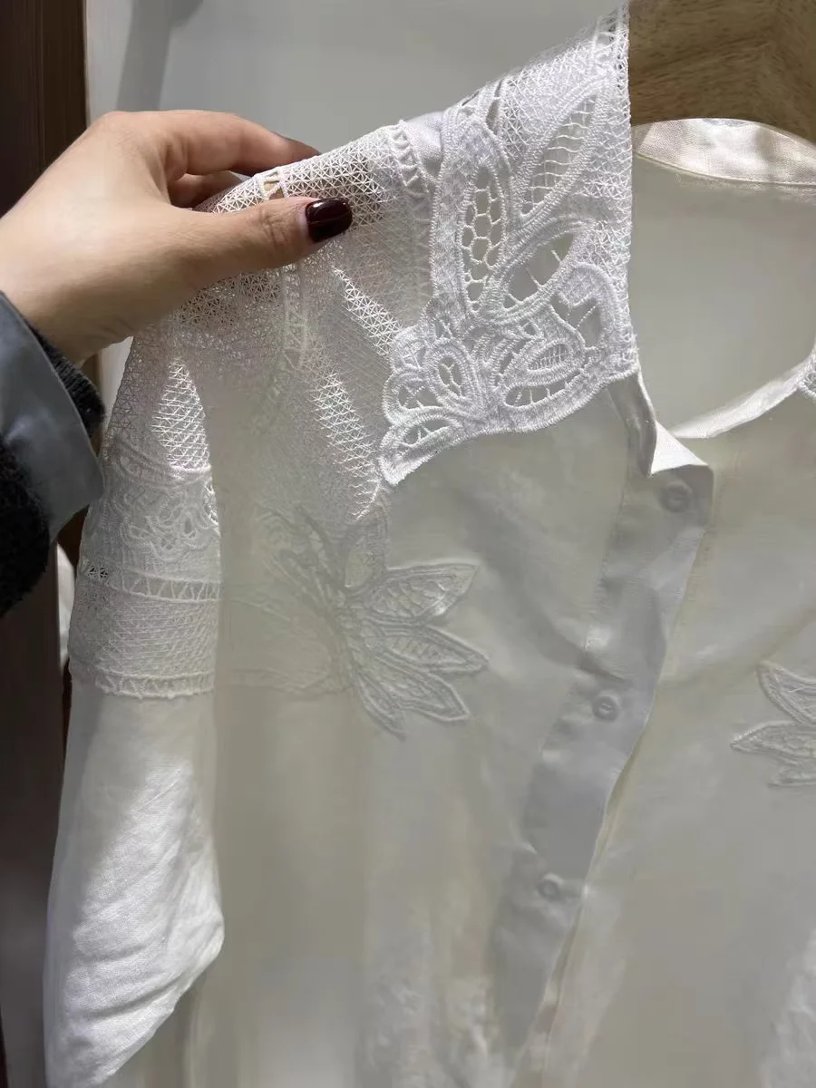 New Brand Woman Mid-length Loose Casual Top Blusas Women Clothing 2025 Flower Hollow Out Embroidery Cotton Shirts and Blouse
