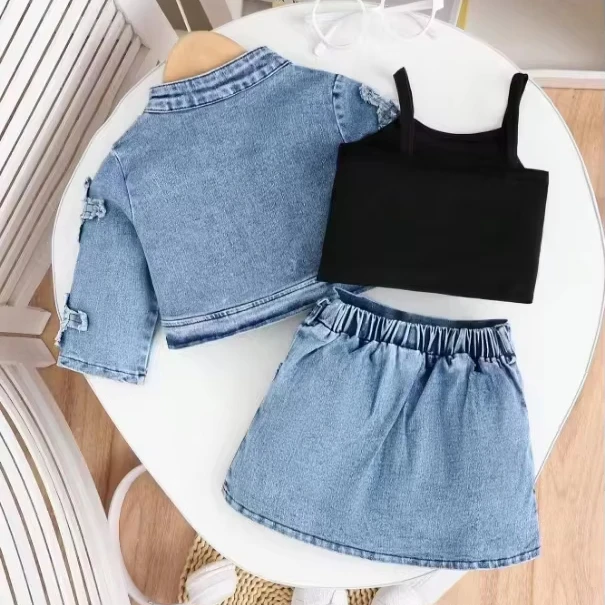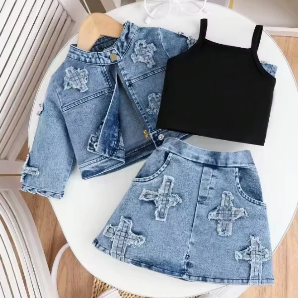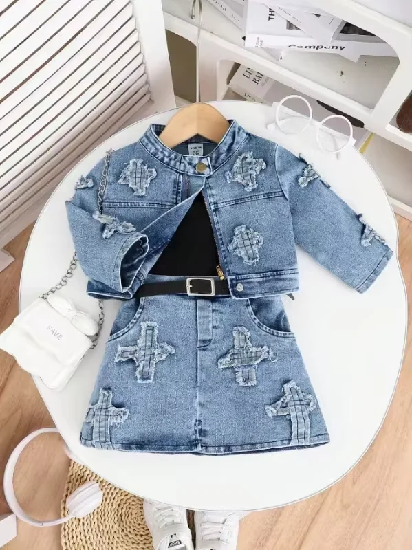 New Fashion 3PC Girls Clothing Boutique Long Sleeve Denim Jacket with Short Skirt Suit for Autumn and Winter Letter Pattern
