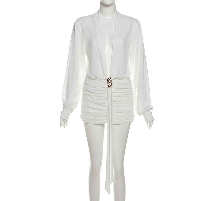 Peeqi K25D77359 Autumn New 2025 Style Women’s Dress Graceful Sexy Deep V-neck Pleated A-line Long Sleeve Shirt Dresses for Women