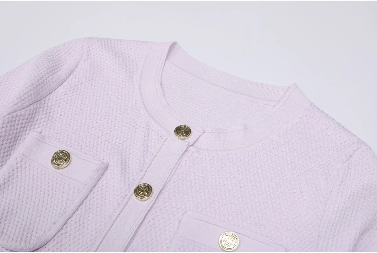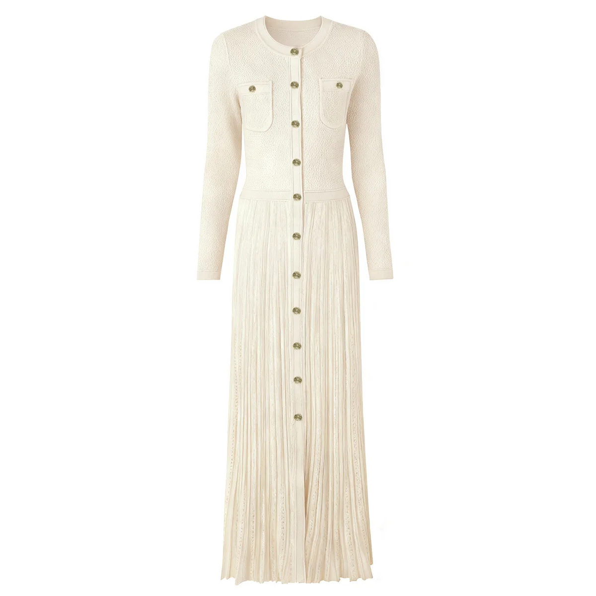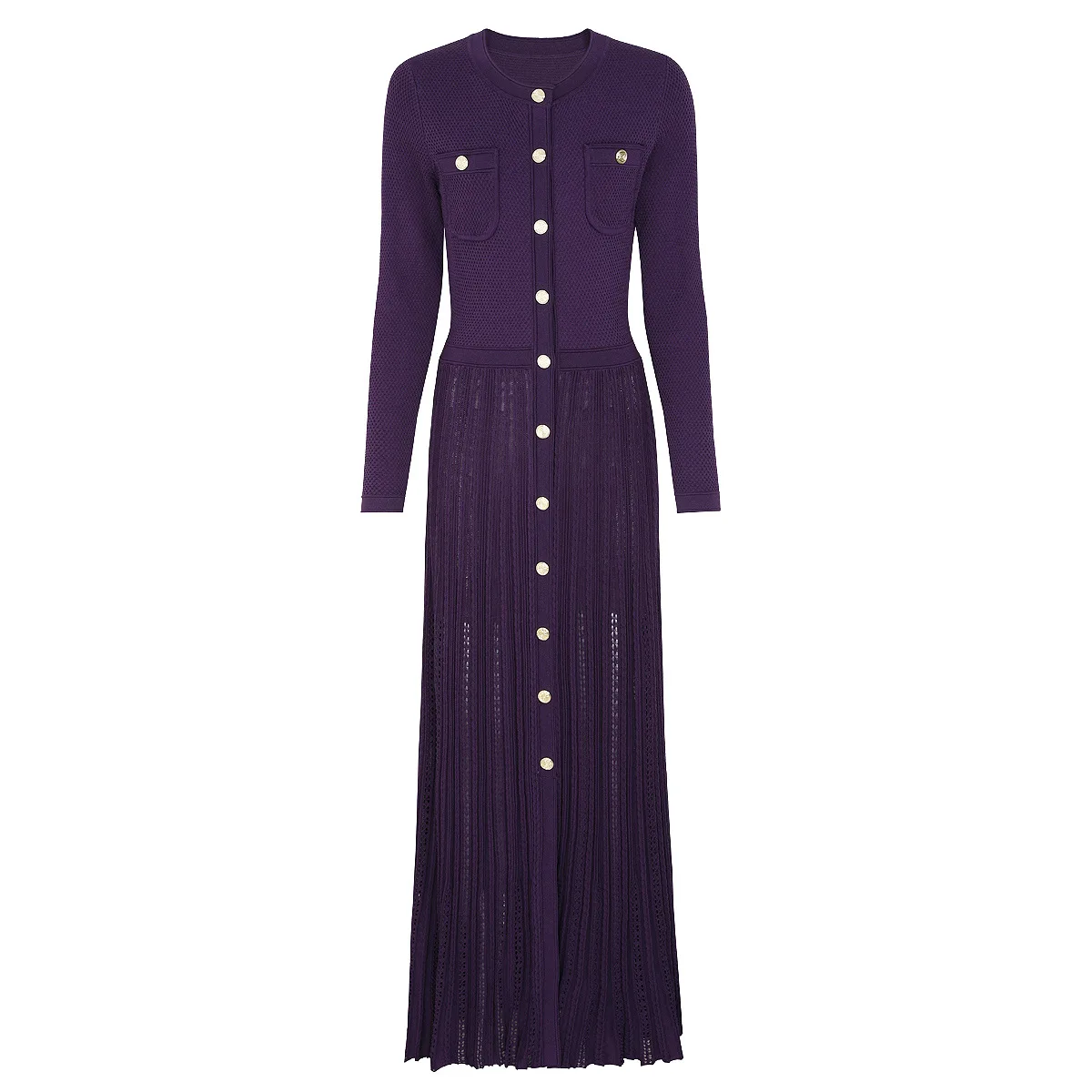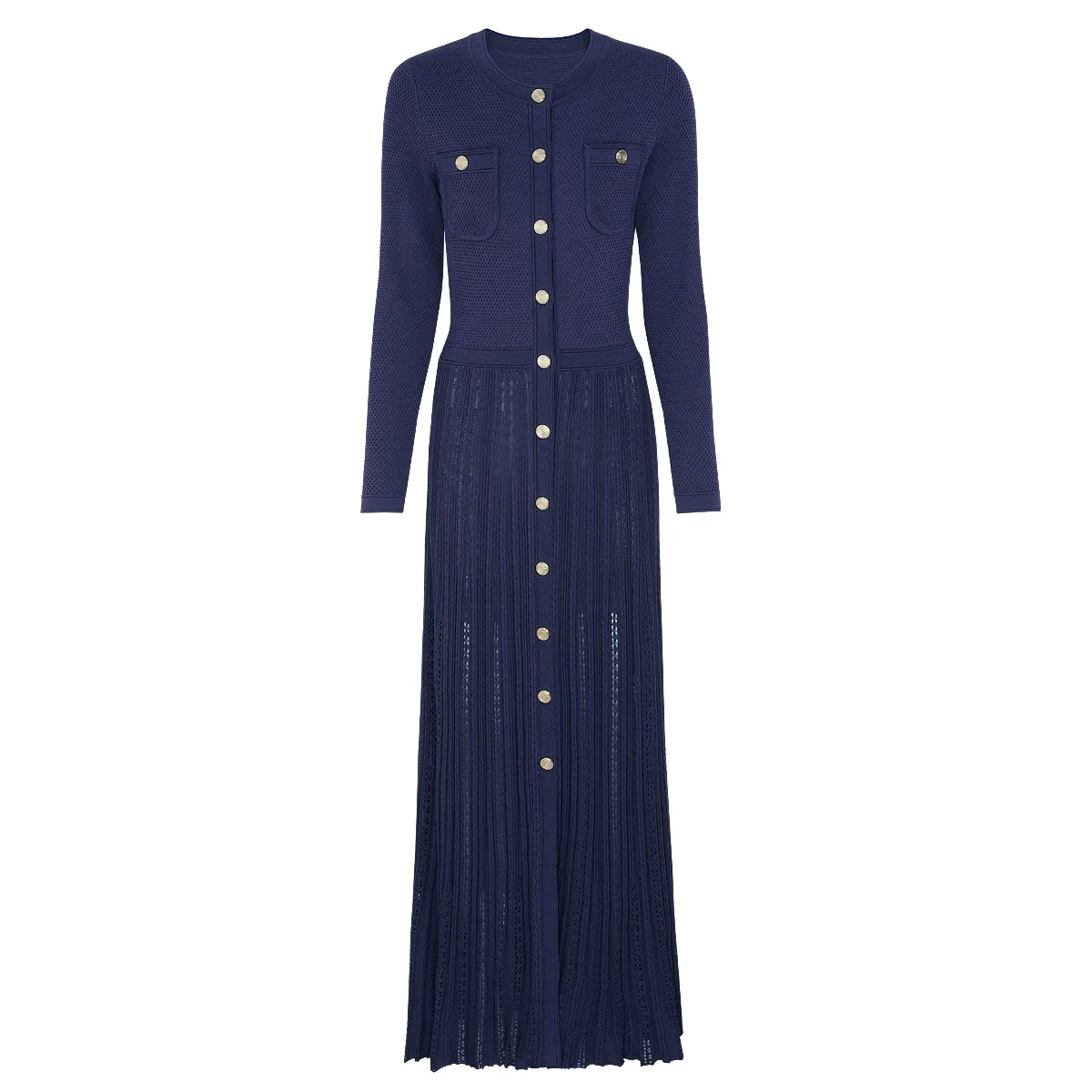 Quality 2025 In Stock Autumn Lady Elegant Style Solid O-neck Long Sleeve Single-breasted Women Hollow Out Knit A-line Maxi Dress