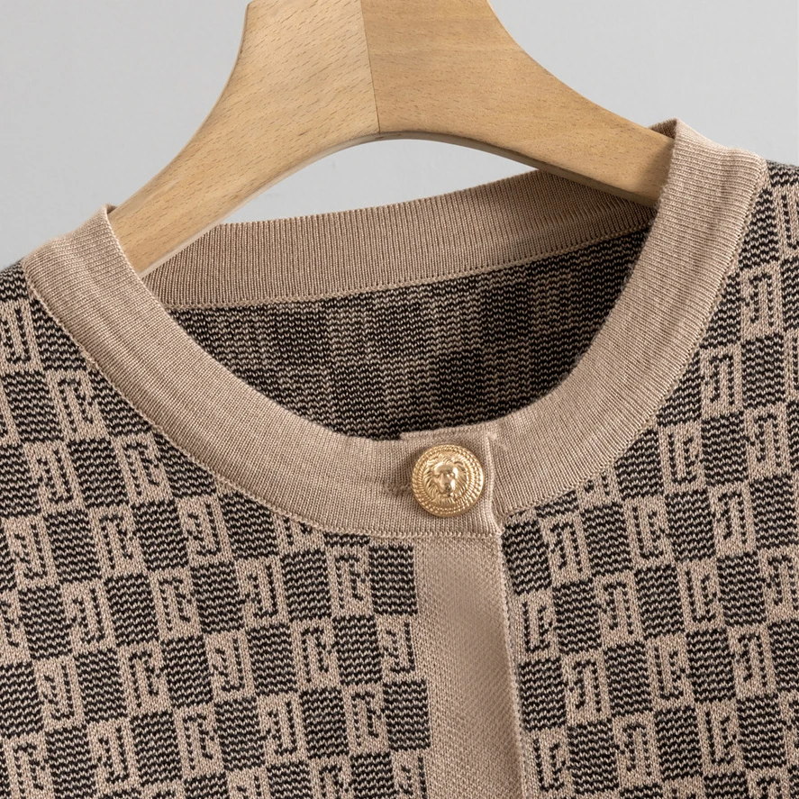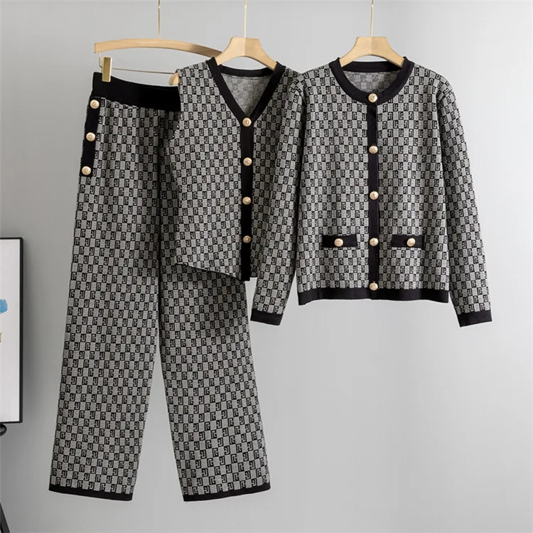 Spring Autumn Plaid Cardigan Knit Set Casual Elegant Knit Cardigan and Vest and Pants Set Knitted Two Piece Set for Women
