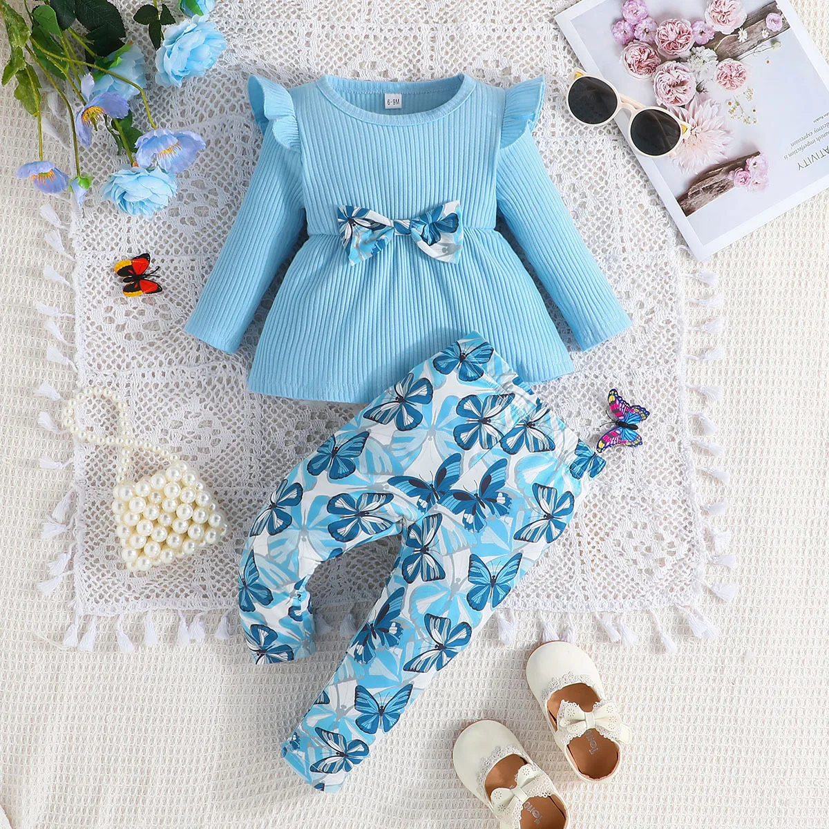 Top Quality Spring Autumn Kid Girls Clothes Set Casual Pure Color Long Sleeve Top & Butterfly Pattern Pants 2 Pieces