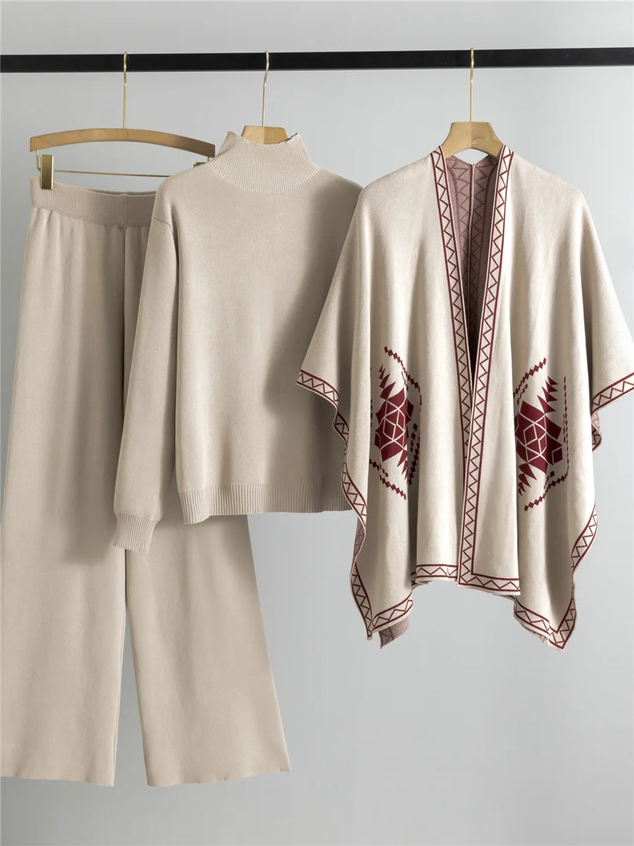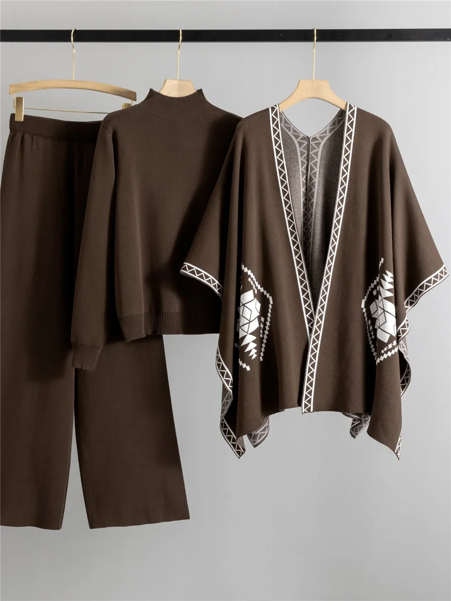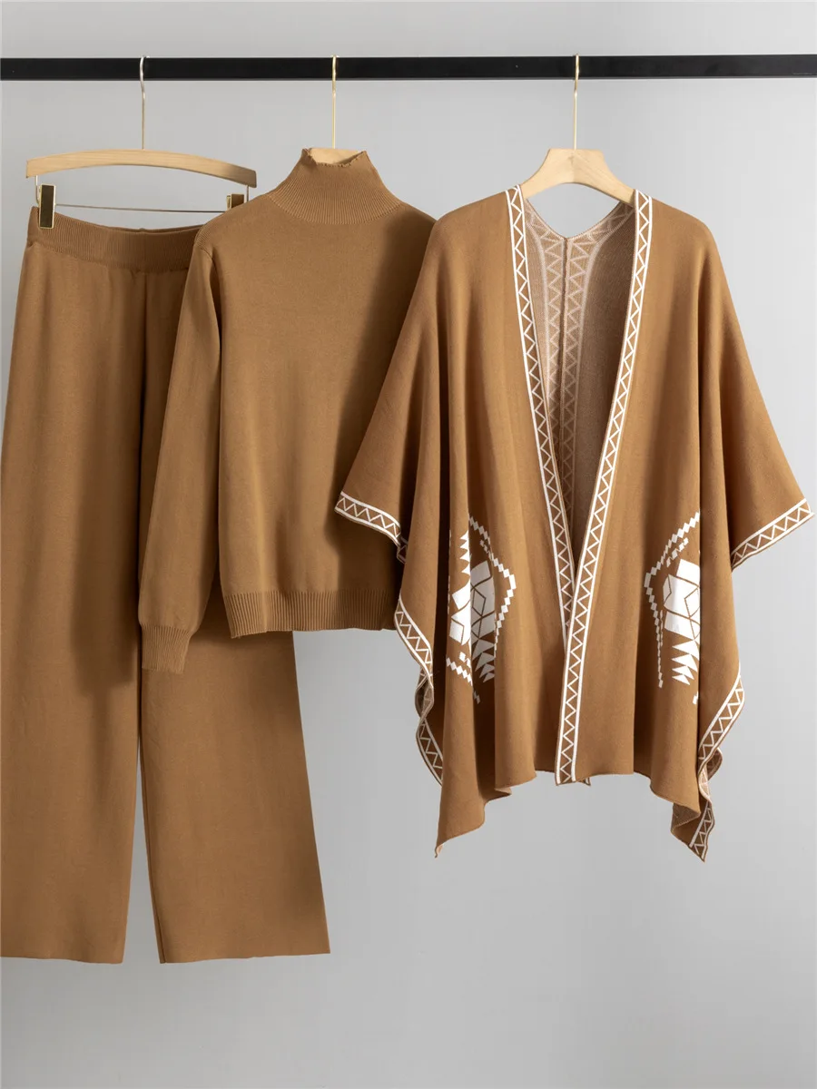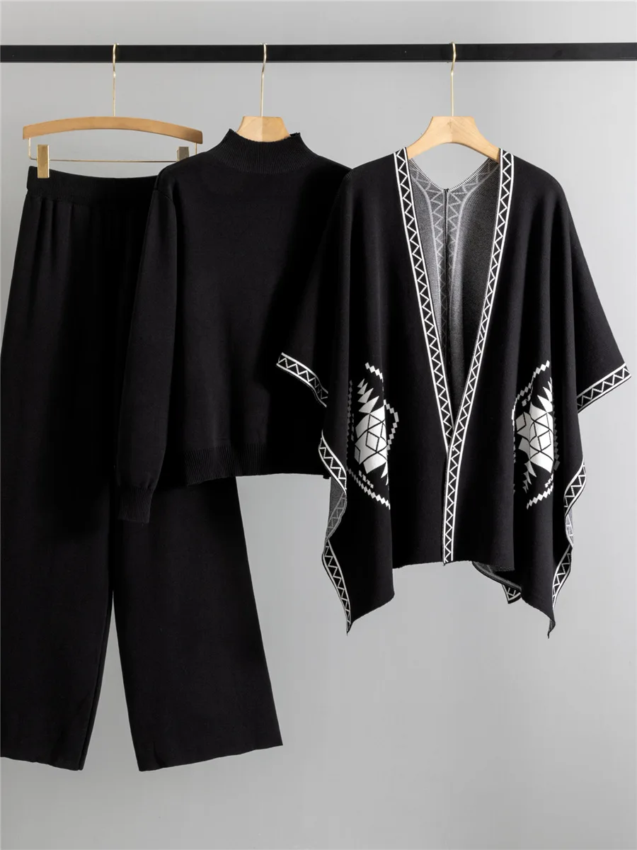 Women’s Autumn Winter Solid Casual Three-Piece Set Knitted Sweater Shawl Cape Coat Long Wide Leg Pants