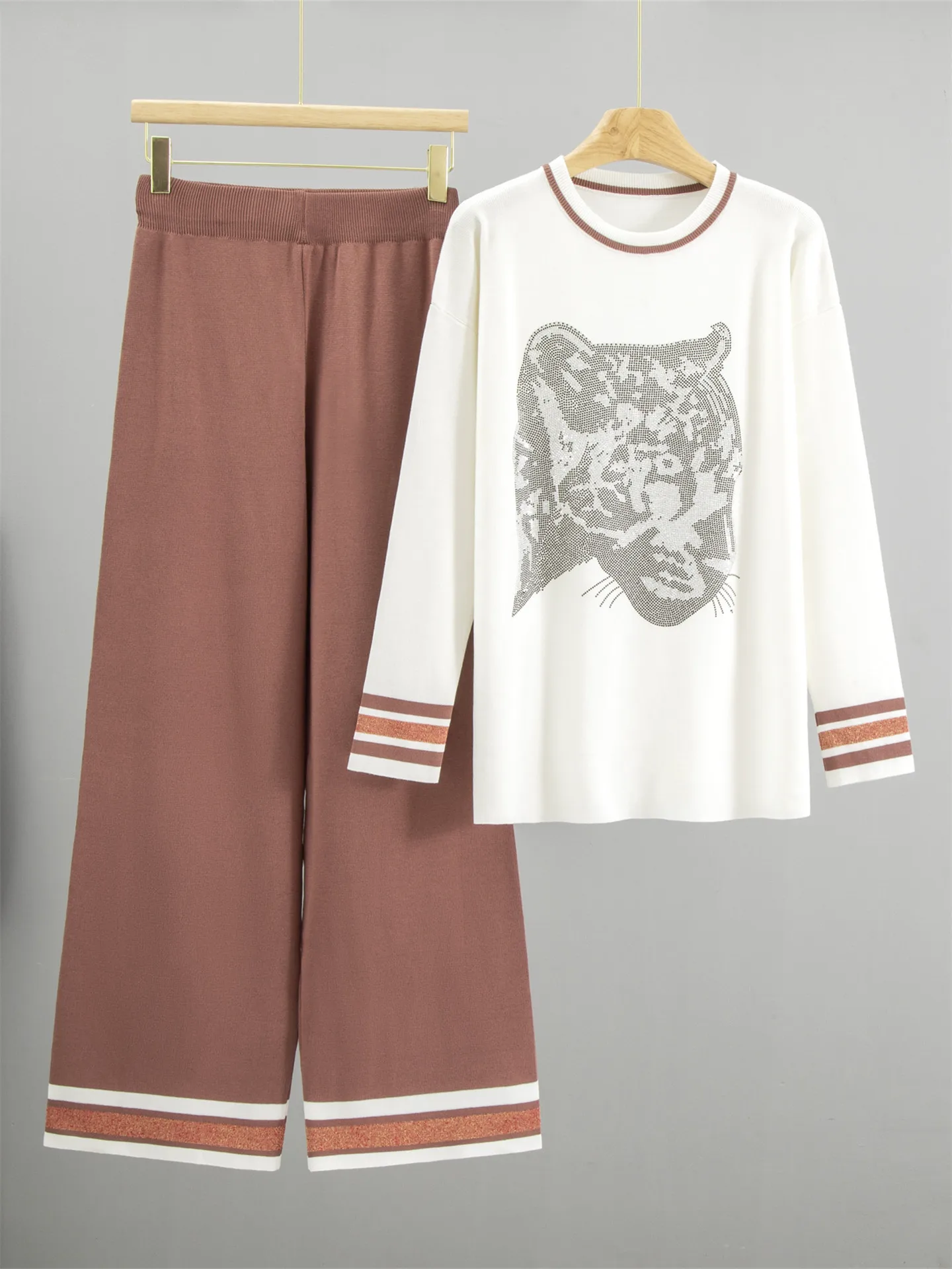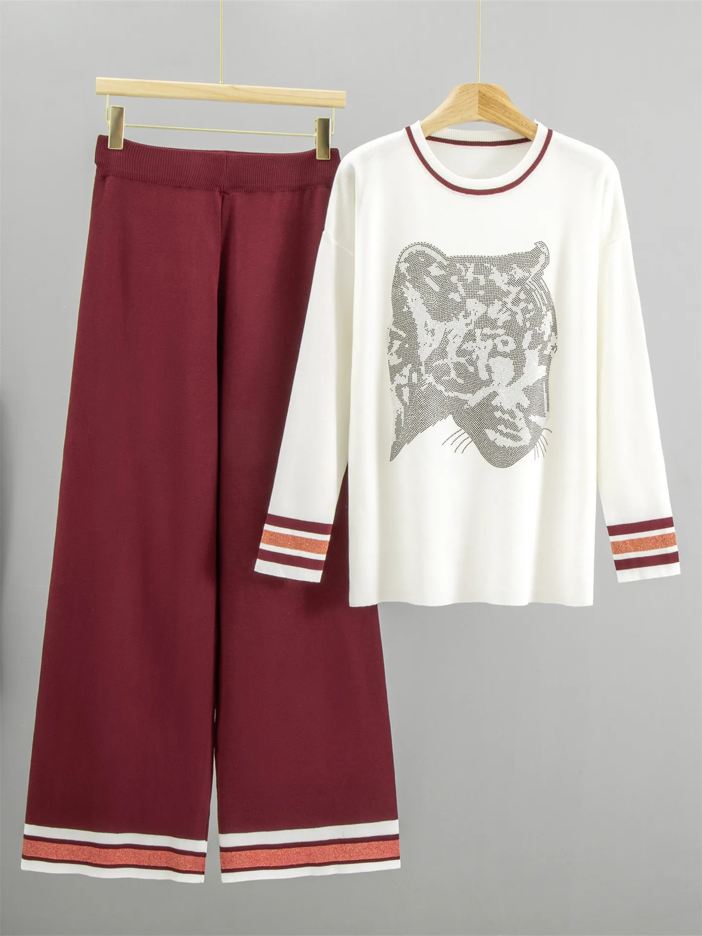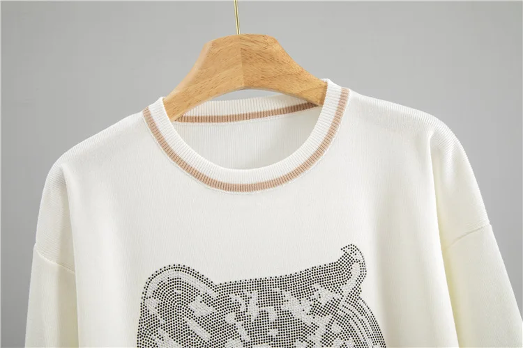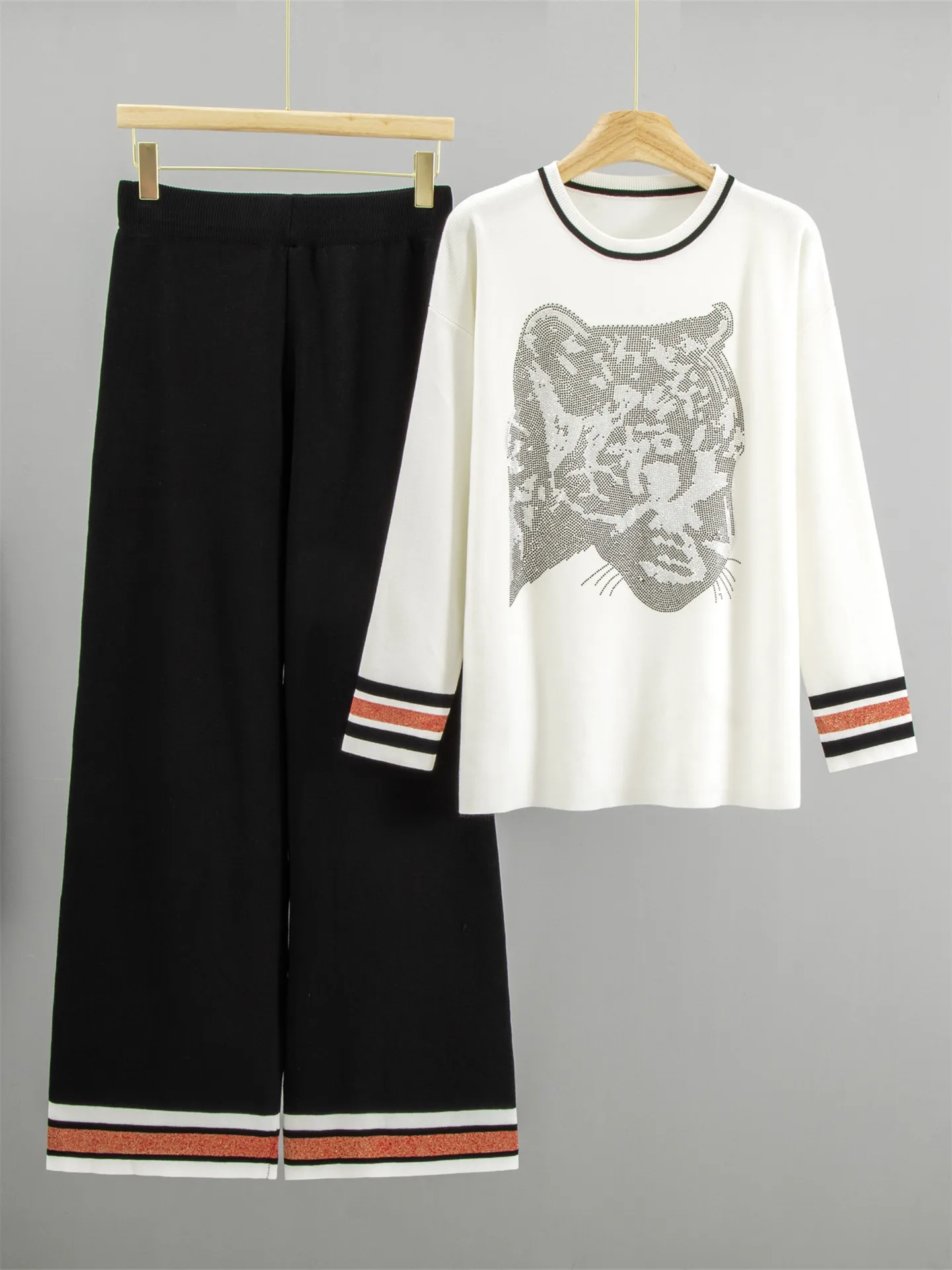 Women’s Casual Loose Sweater Set Autumn New Cross-Border Fashion Trendy Two-Piece Leopard Head Knitted Jacket Hot Drilling