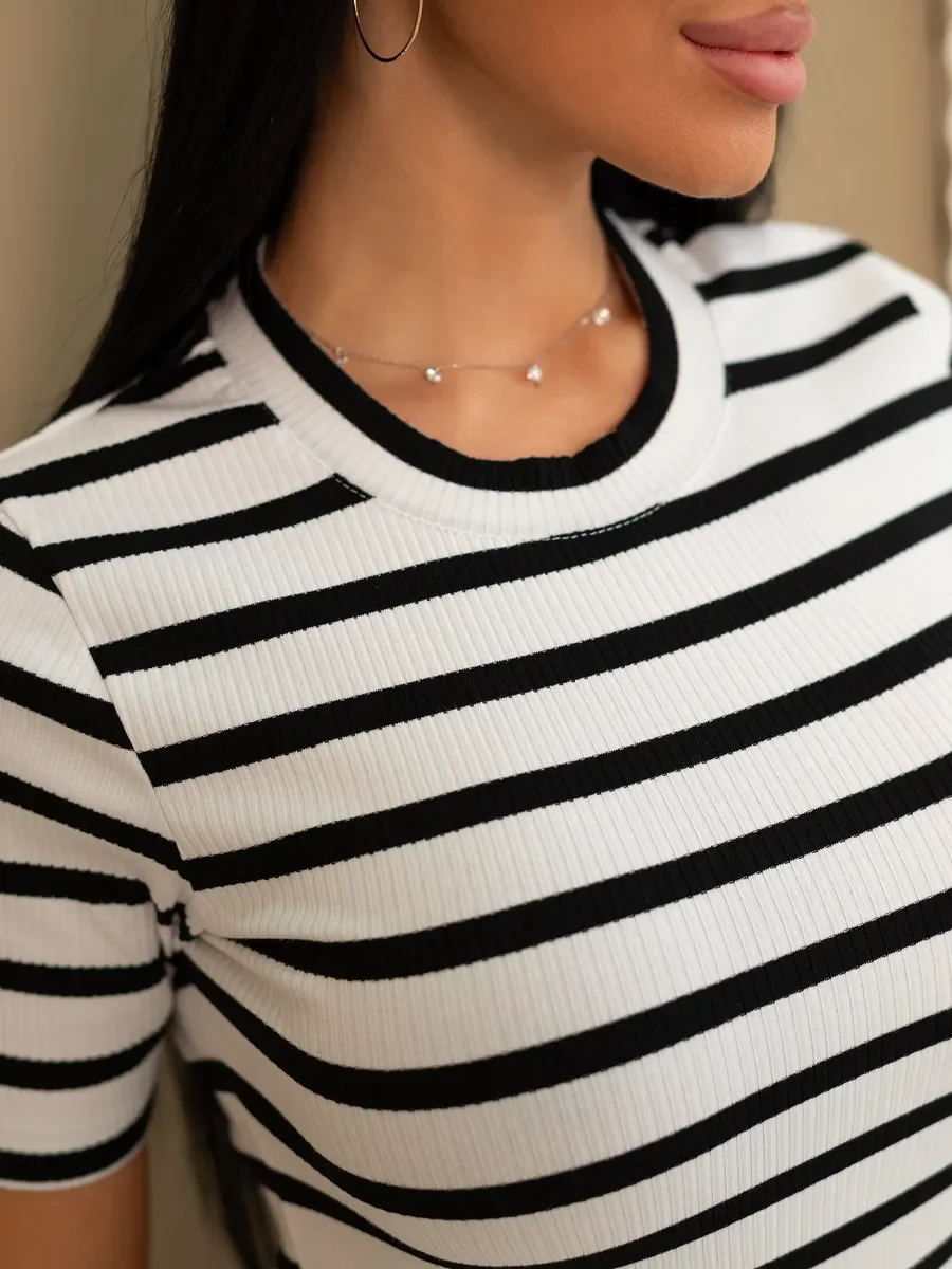 Women’s Eco-Friendly White Black Striped Midi Dress Short-Sleeved Bodycon Style Natural Waistline for Spring Autumn Summer Wear