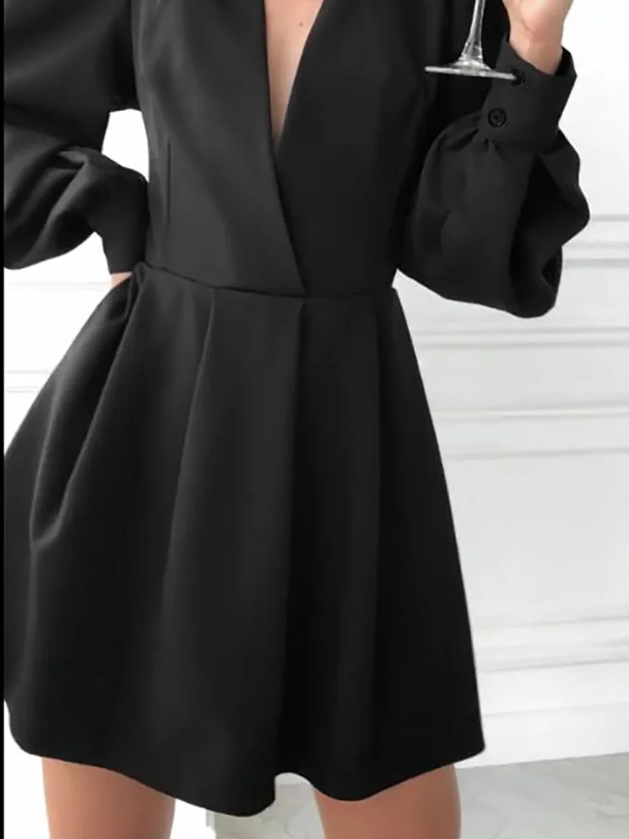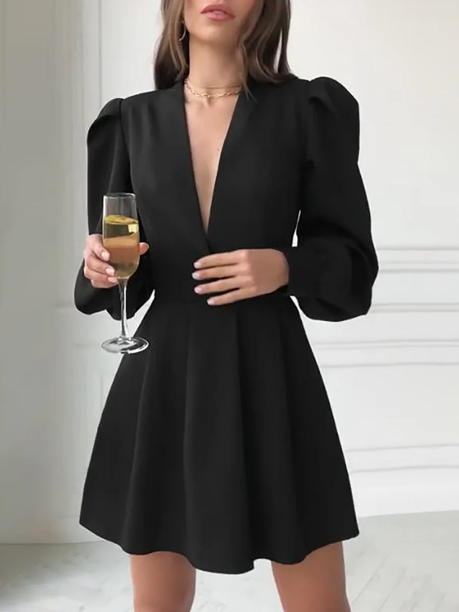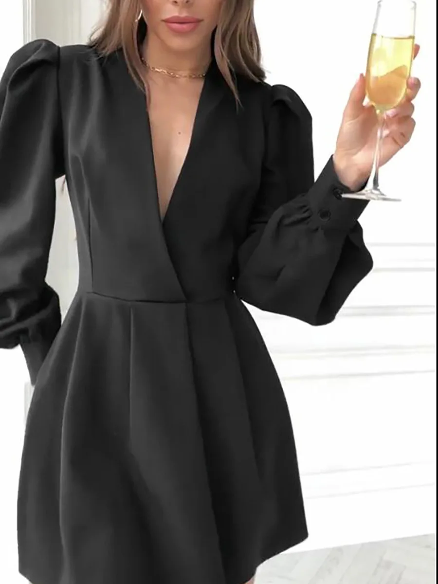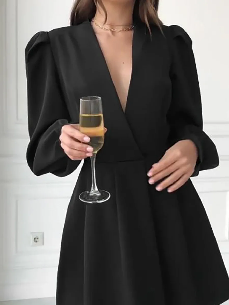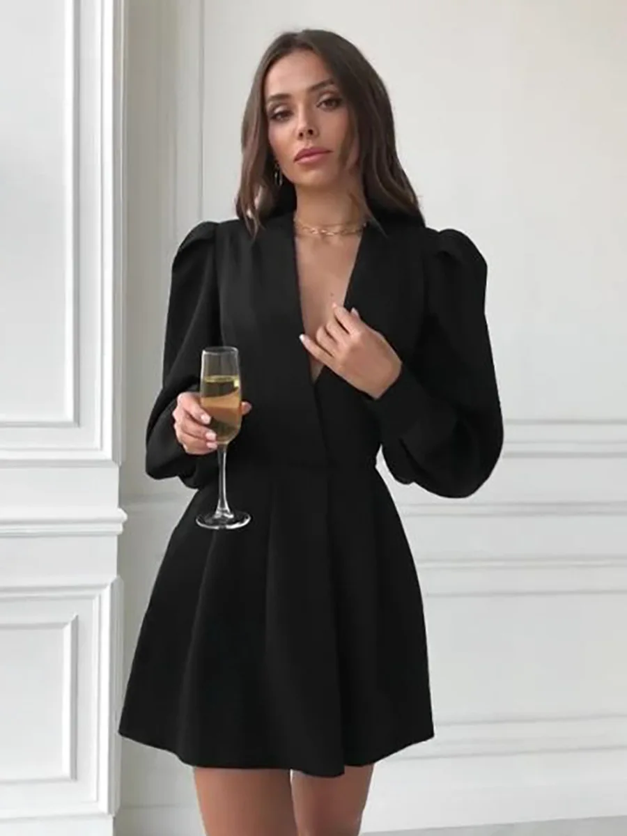 Women’s Elegant A-Line Dress French Hepburn Style Black Mature V-Neck Autumn Short Clothing Elegant Waist Puff Solid Casual XS