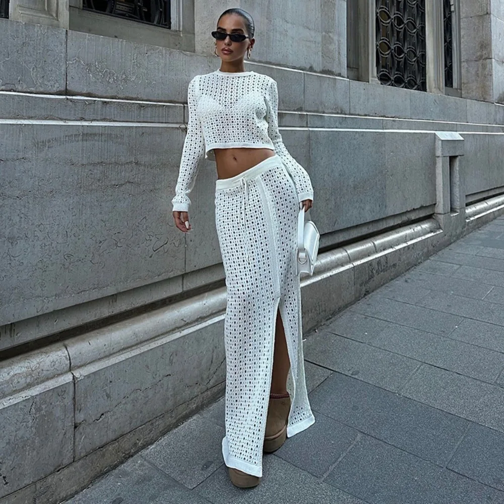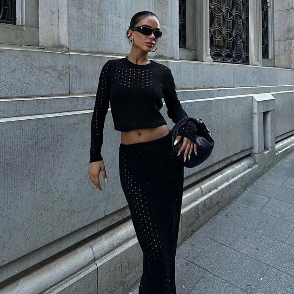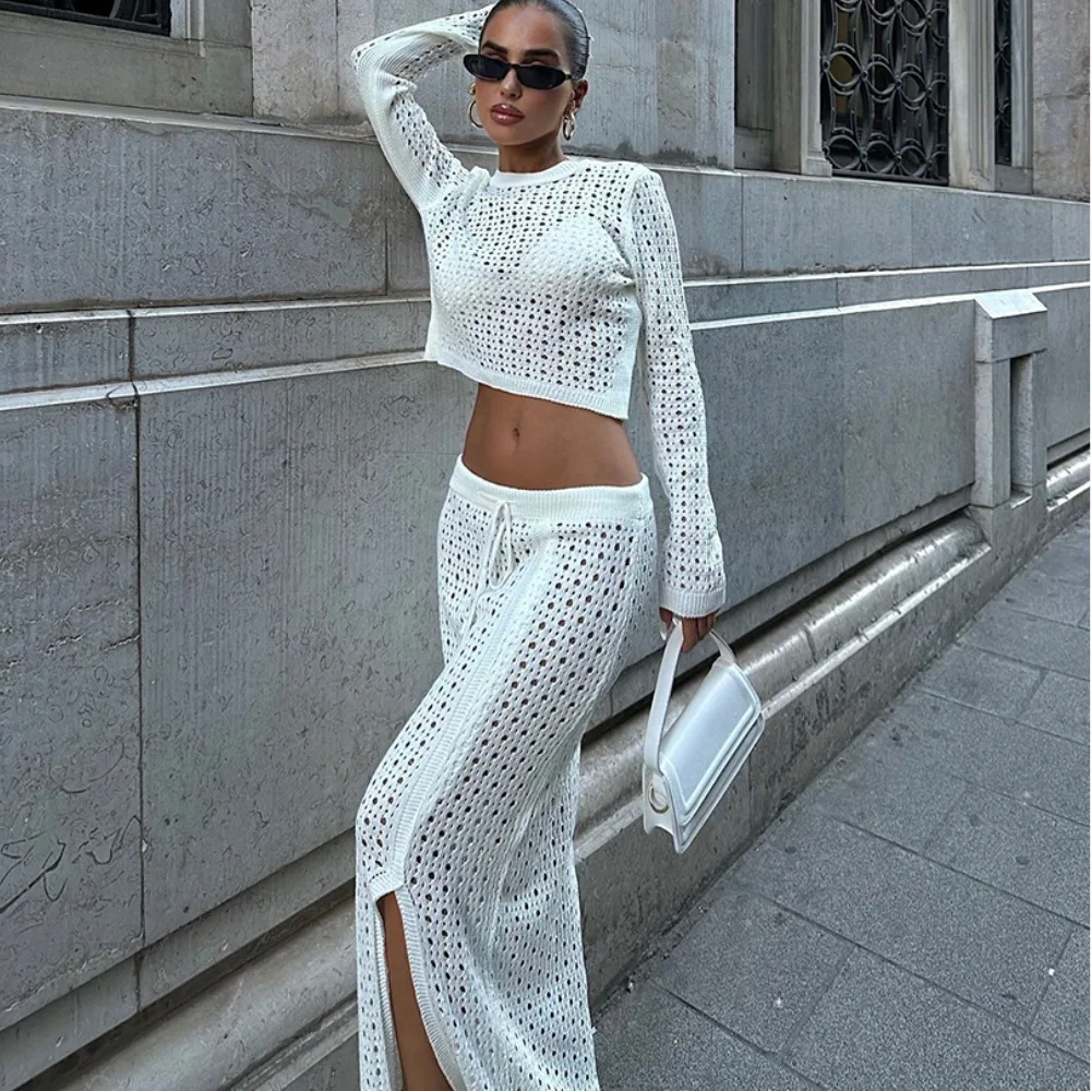 Women’s Elegant Mature Style Sexy Cutout Knit Beach Dress Set Casual Vacation One-Set for Autumn Season