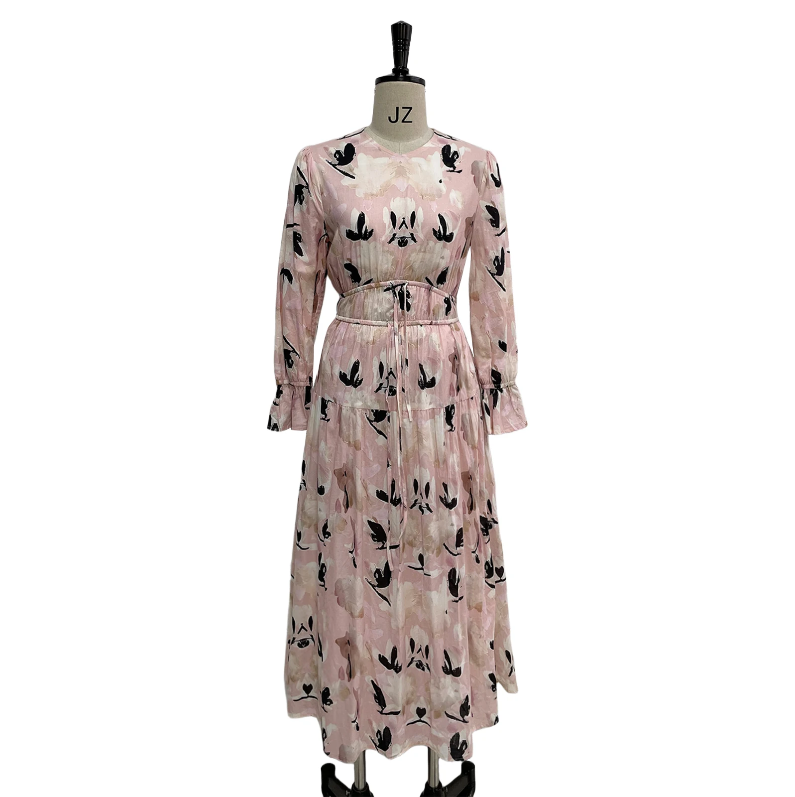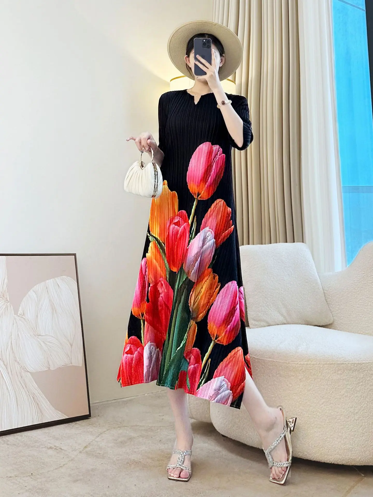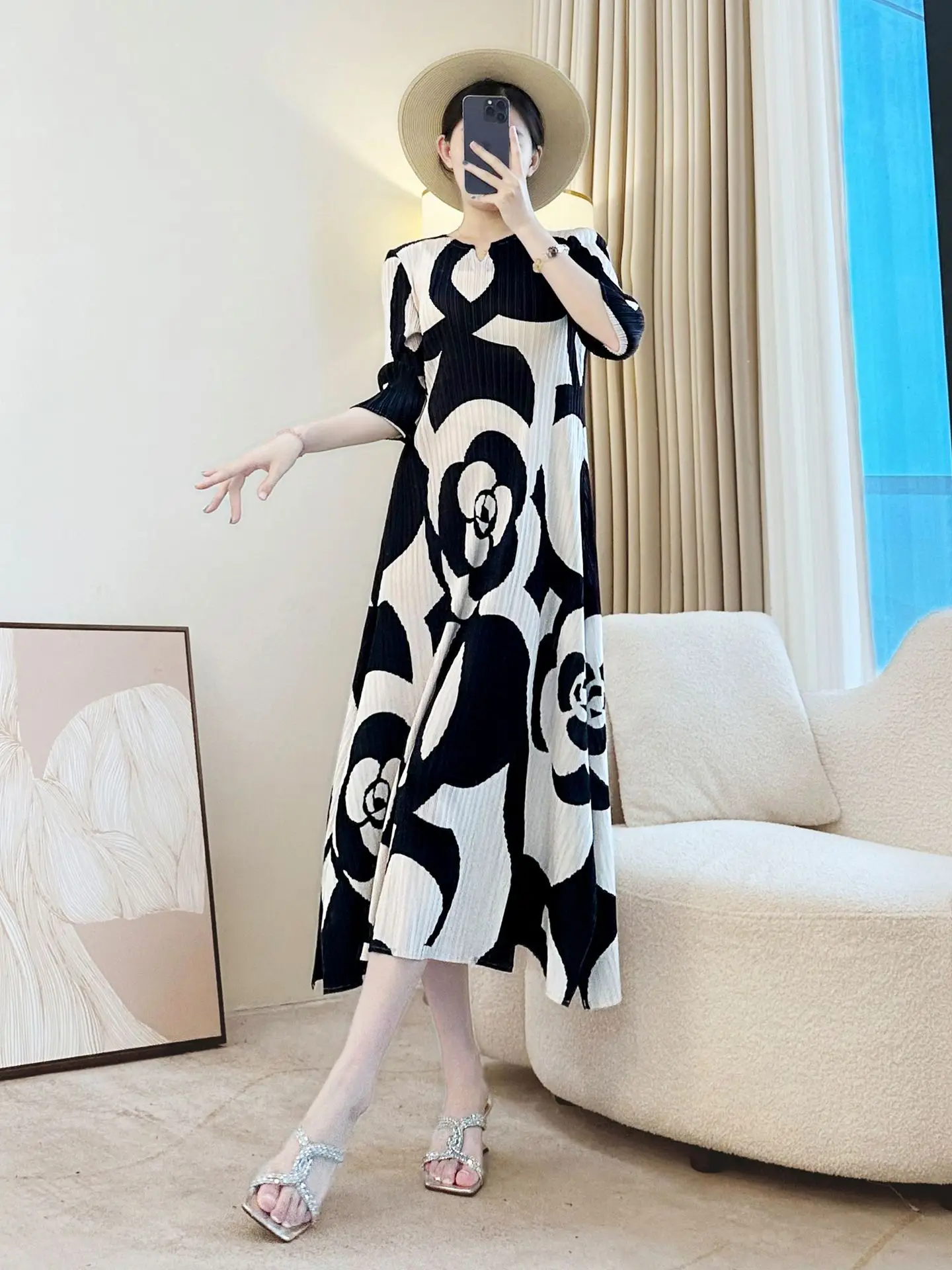 Women’s Elegant Printed Miyake Long Dress High-End Pleated for Autumn Sanya Seaside Holiday Beach Casual Summer Fashion Natural