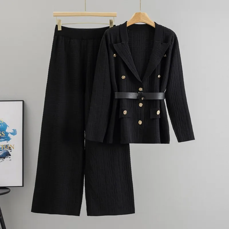 Women’s Elegant Solid Pattern Long Sleeve Knit Blazer and Loose Trousers Autumn Winter Knitted Pantsuit Set Casual Style