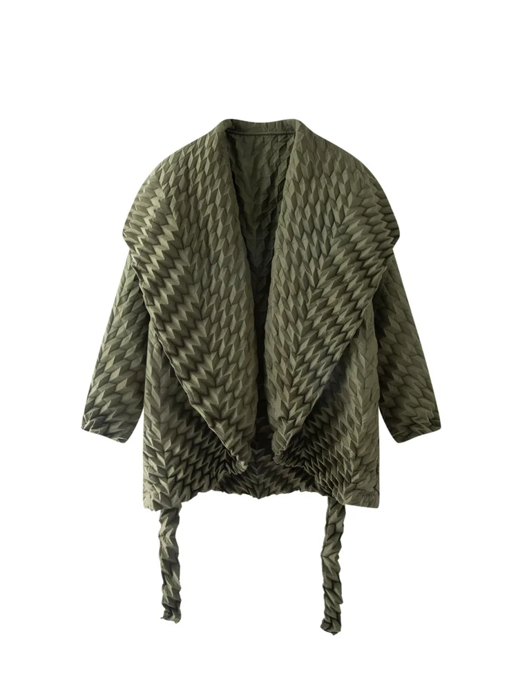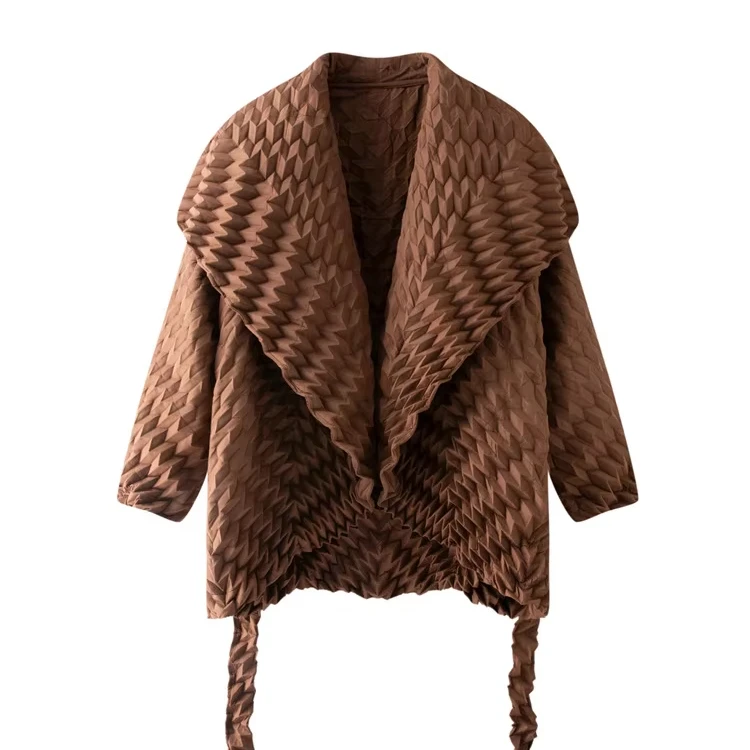 Women’s High-End Autumn New Short Jacket Pleated Lace-up Handmade All-Season Casual Loose Cardigan Top Solid Pattern Woven