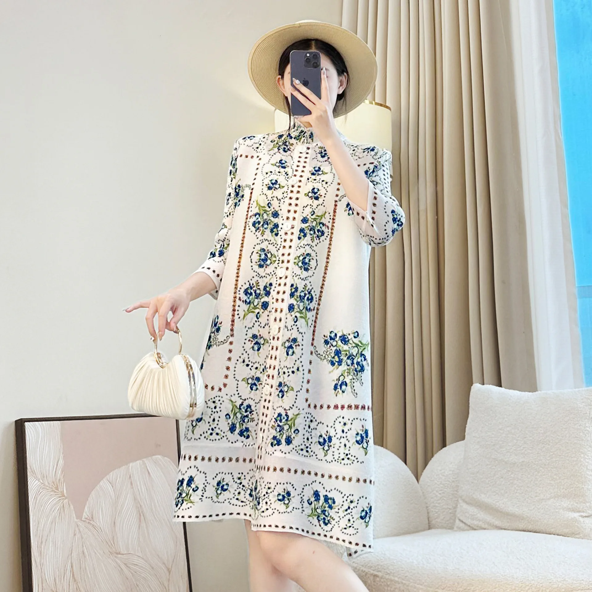 Women’s High-End Miyake Shaking Spring Skirt Large Size Holiday Printed Dress for Spring Autumn Casual Pleated Design Polyester