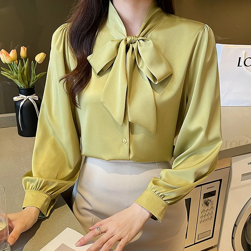Women’s Loose-Fitting Spring Autumn Long Sleeved Chiffon Blouse Solid Color Korean Gentle Style Office Lady Top Bow Simple
