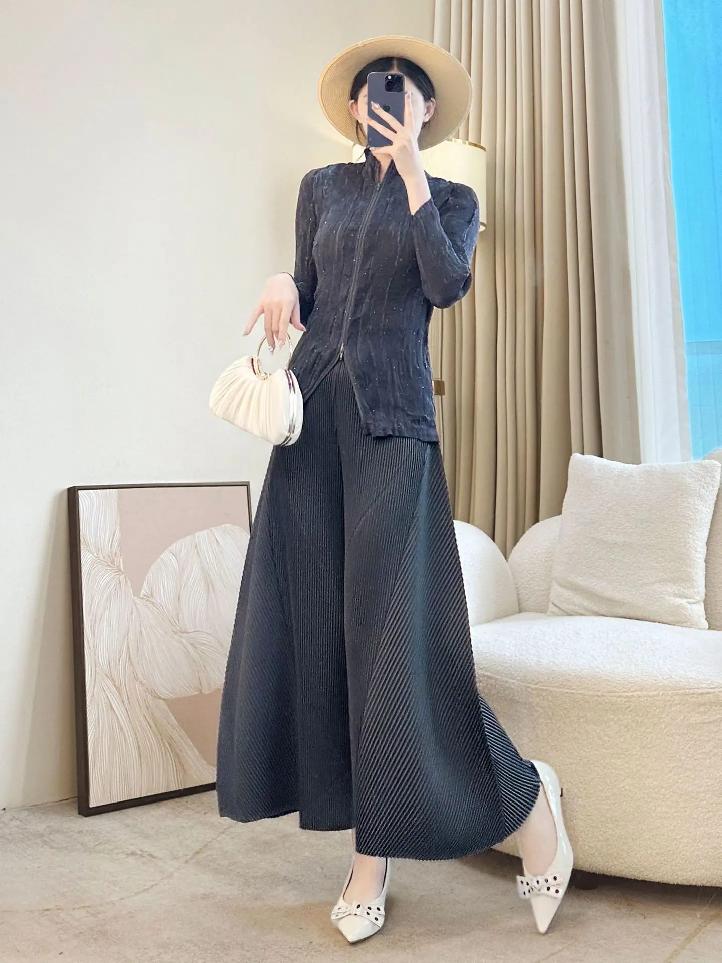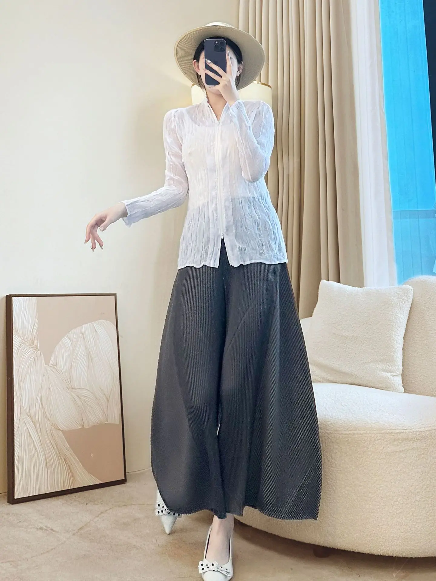 Women’s Summer Miyake Pleated Jacket Joker Slim Skirt and Coat in Vintage Style Solid Polyester Woven for Spring and Autumn