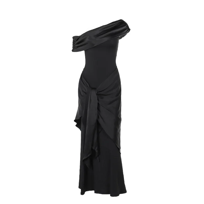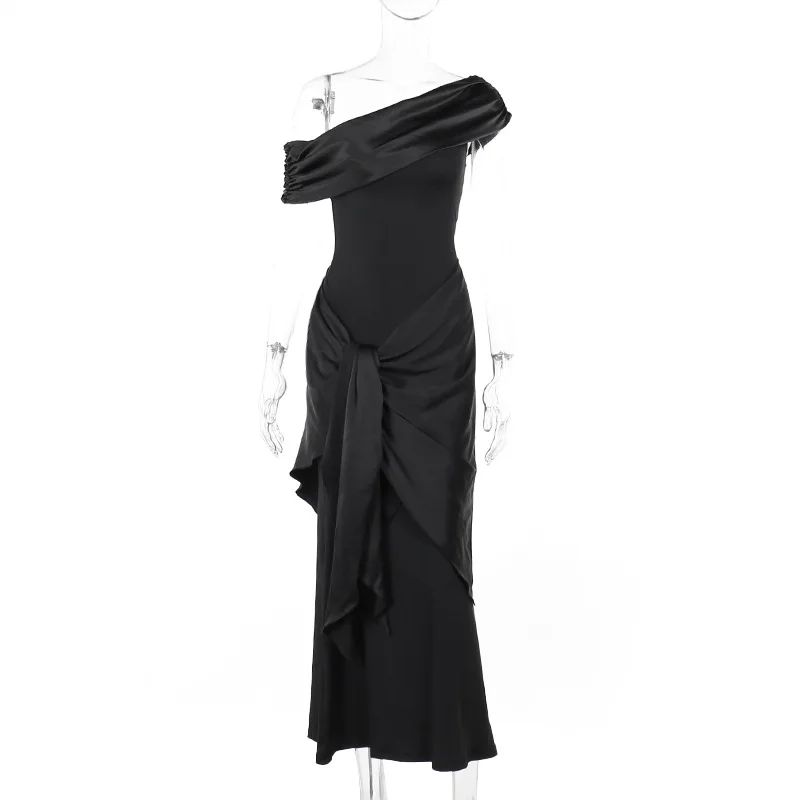 YJ23706 Women’s Elegant Off-Shoulder Waist-Cinching Dress Long Slim Fit Black Sexy Autumn Fashion European American Inspired Ins