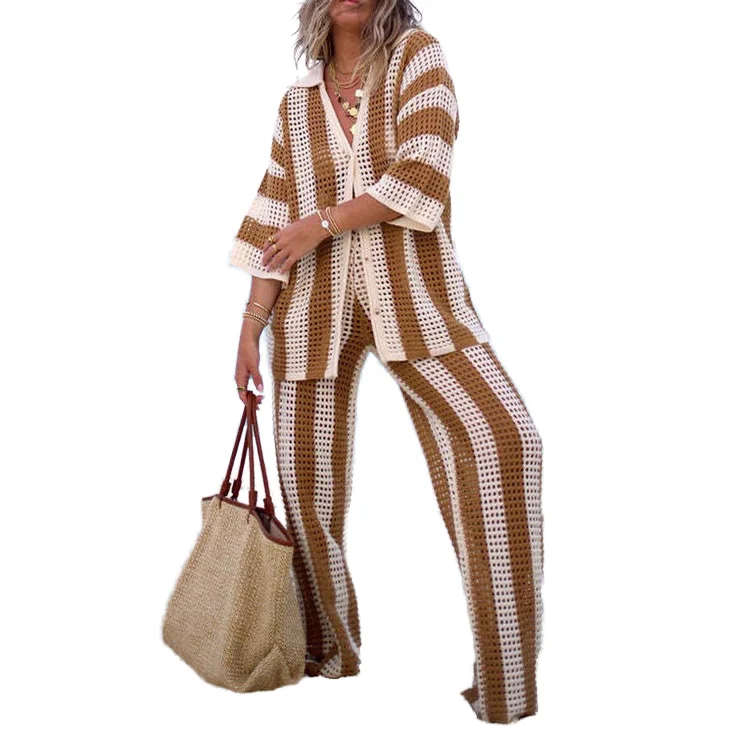 Z0318 Wholesale Women’s Clothing Set 2025 Autumn/fall Stripe Outfits for Women Crochet Sweater Top With Two Piece Pants Set