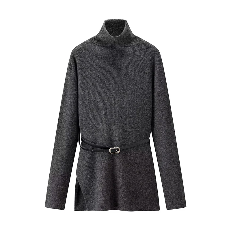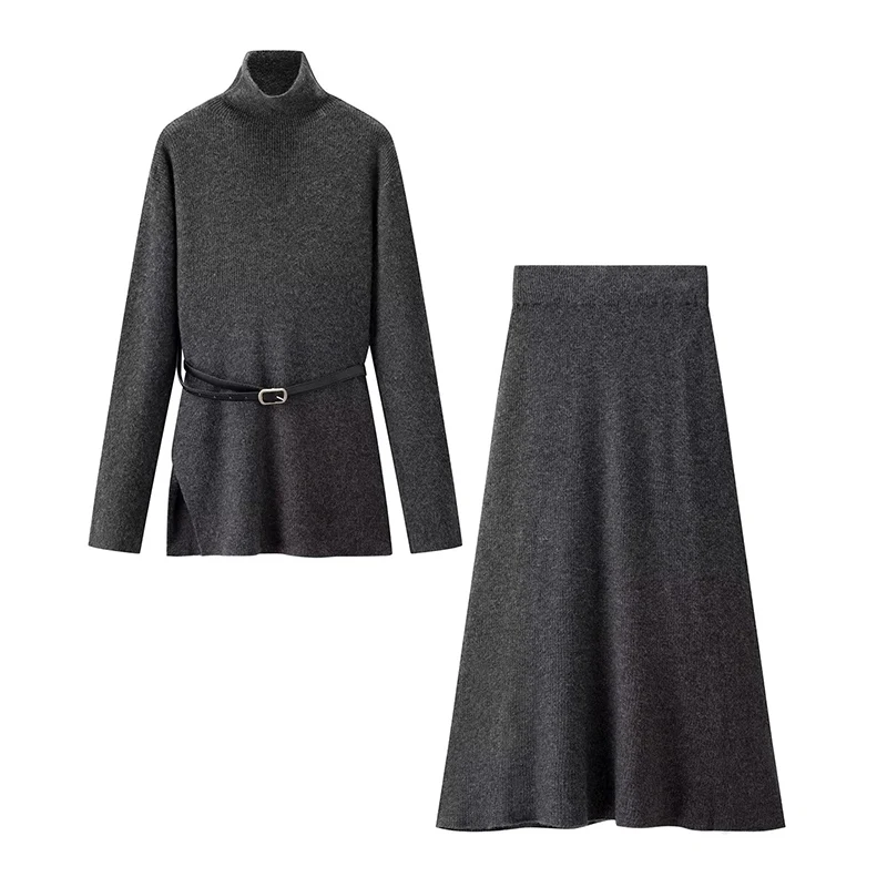 ZATRHMBM Women’s Clothing 2025 New Fashion Belt Decorated Knitted Sweater Suit Retro Turtleneck Sweater + Skirt Two-piece Set
